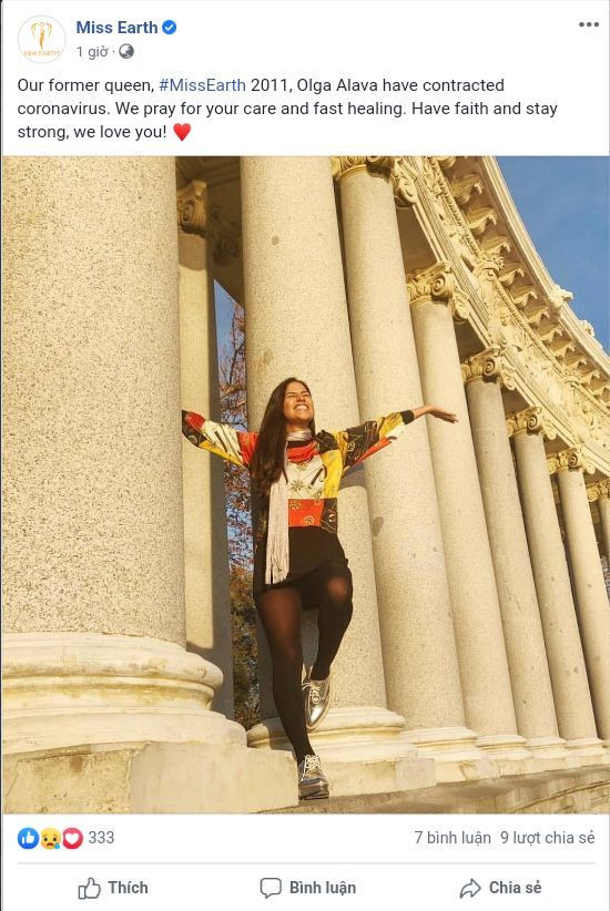 Mới đây, Fanpage của cuộc cuộc thi Hoa hậu Trái đất (Miss Earth) đăng tải thông tin xác nhận Hoa hậu Trái Đất 2011 - người đẹp Olga Alava đến từ Ecuador đã nhiễm virus SARS-Cov-2.