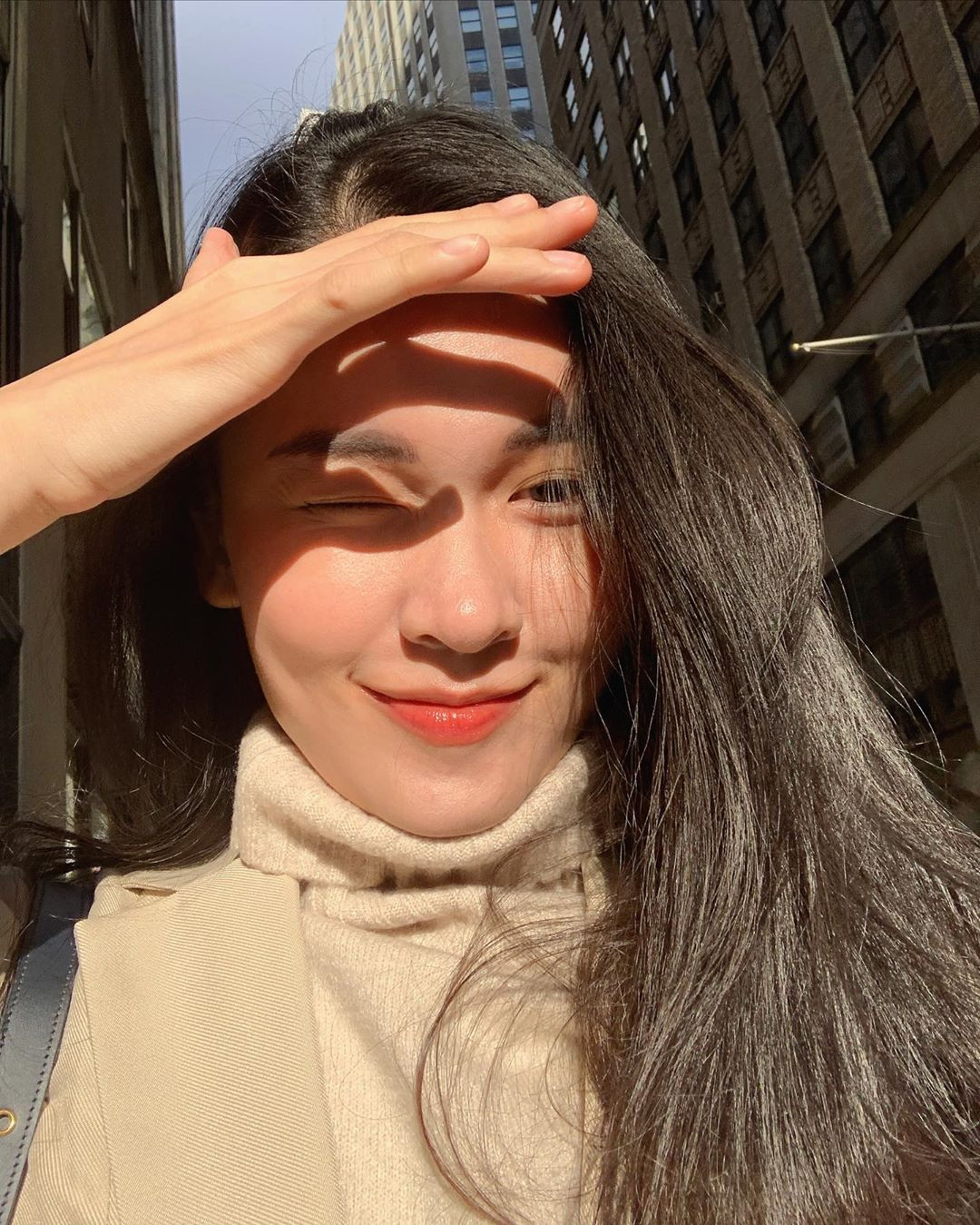 Á hậu Thuỳ Dung khoe vẻ xinh đẹp rạng người dưới ánh nắng ban mai.