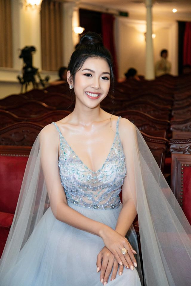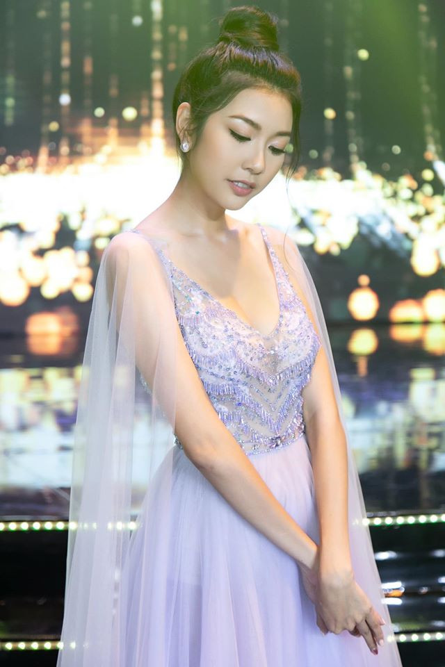Trong khi đó, Á hậu Thuý Vân lại khoe nhan sắc xinh đẹp trong bộ váy dạ hội màu tím nhạt cùng kiểu tóc búi cao quý phái.