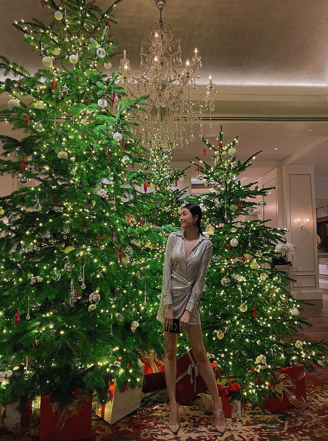 Á hậu Lệ Hằng khoe chân dài miên man bên cây thông Noel.