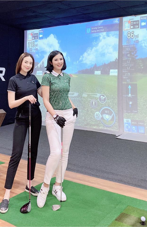 Hoa hậu Ngọc Hân và 'cô gái thời tiết' Mai Ngọc thân thiết trên sân tập golf.