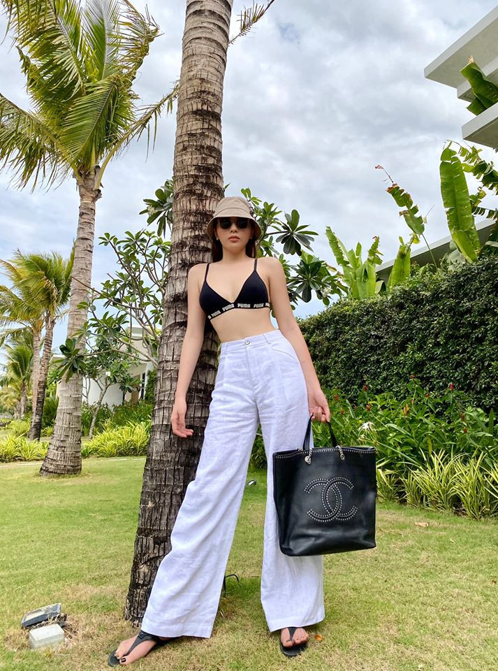 Hoa hậu Kỳ Duyên khoe vòng một nóng bỏng khi mặc áo ngực kết hợp với quần ống xuông màu trắng.