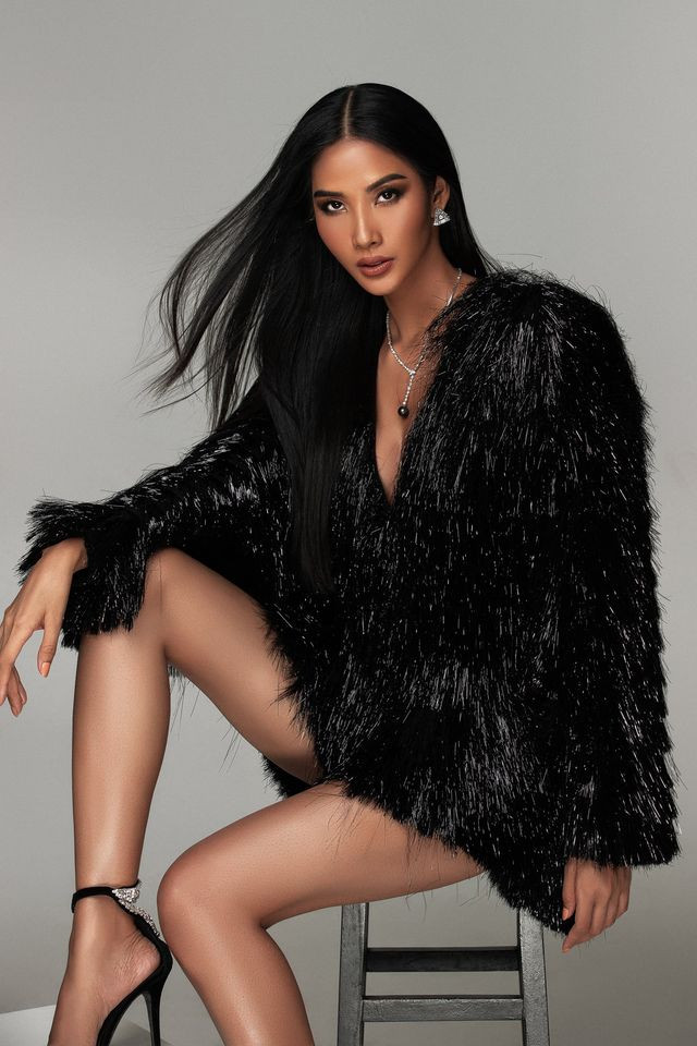 Á hậu Hoàn vũ Việt Nam chỉ khoác trên mình duy nhất chiếc áo lông màu đen, tôn vinh triệt để đôi chân dài 'cực phẩm' vô cùng nuột nà và quyến rũ.