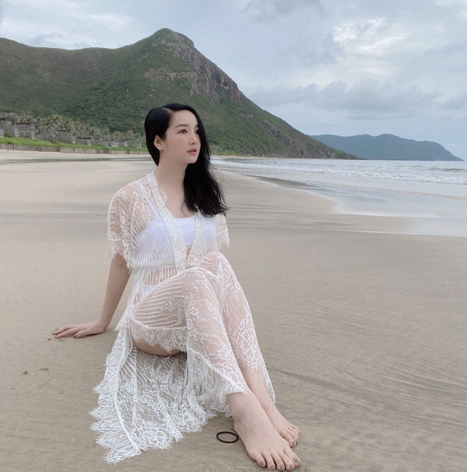 Hoa hậu Giáng My diện áo khoác ren xuyên thấu, hé lộ thân hình thon thả trong bộ bikini màu trắng quyến rũ.