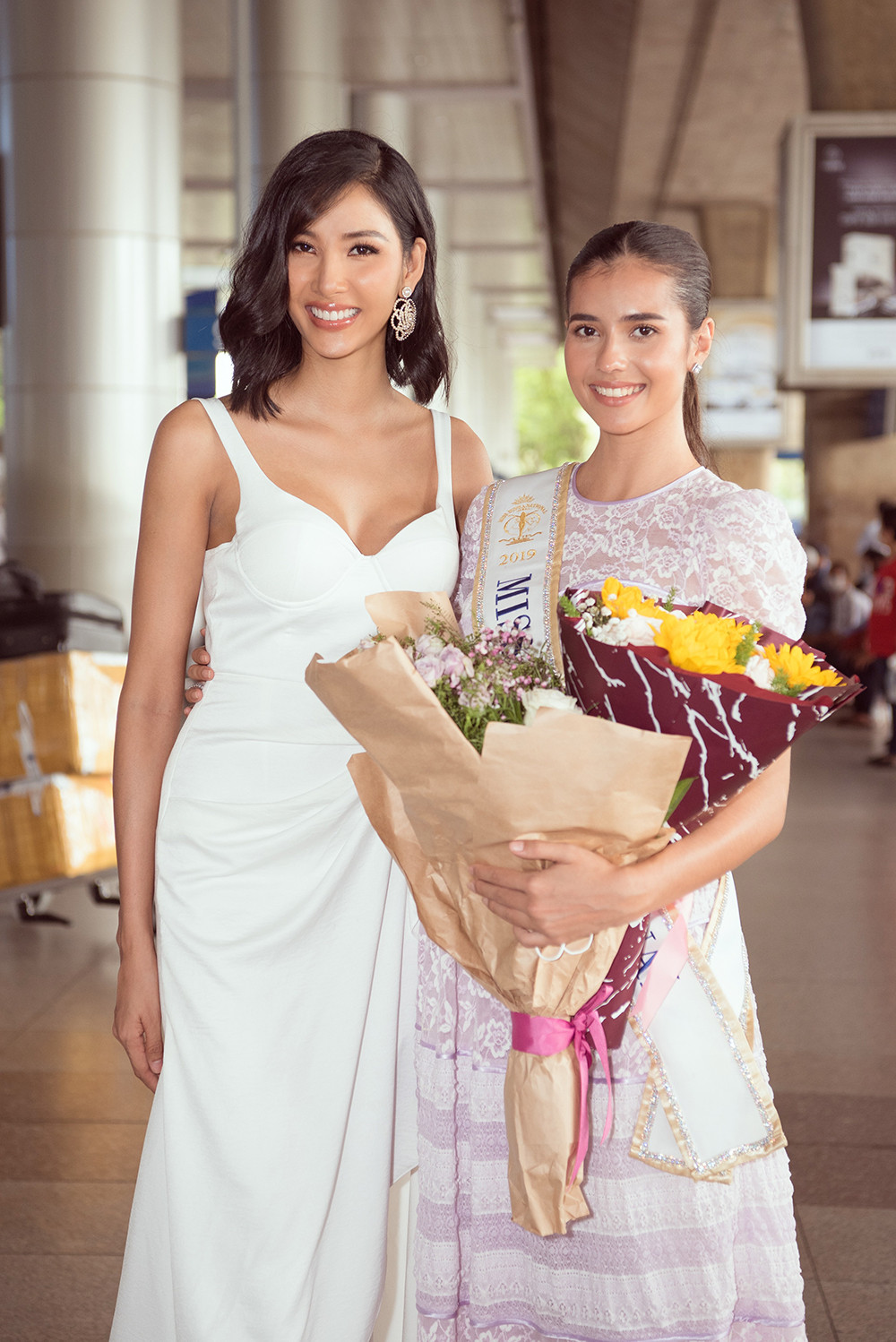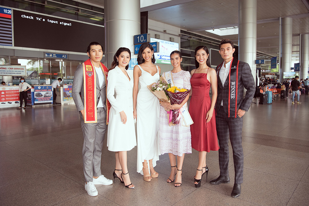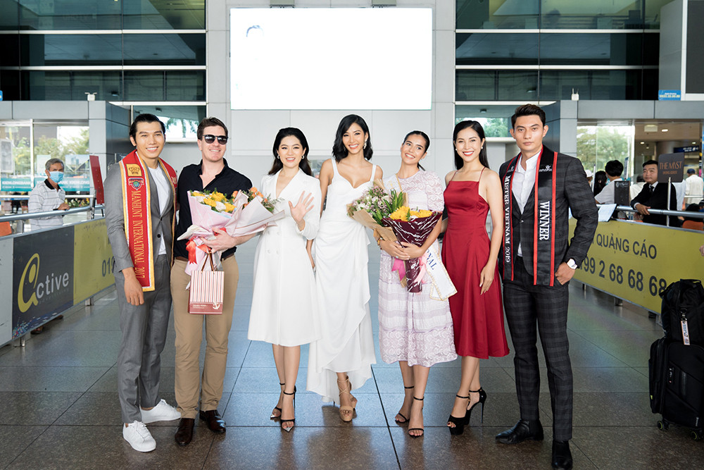 Đương kim Hoa hậu Siêu Quốc gia giản dị trong bộ váy nhẹ nhàng màu tím nhạt, hoạ tiết ren, cô cột tóc phía sau gọn gàng, khoe vẻ nữ tính duyên dáng. Nam vương Ngọc Tình và Quán quân Mister Việt Nam 2019- Minh Quyền lịch lãm xuất hiện tại sân bay đón Hoa hậu Anntonia Porsild cùng đoàn Chủ tịch Hoa hậu Siêu Quốc gia.