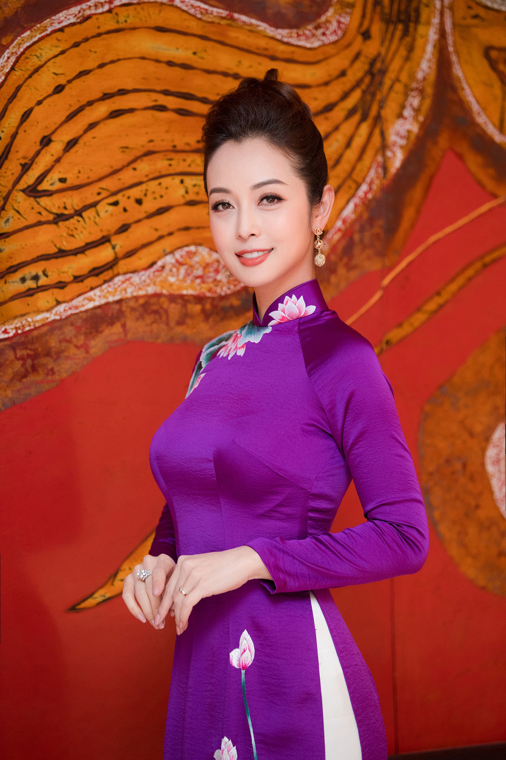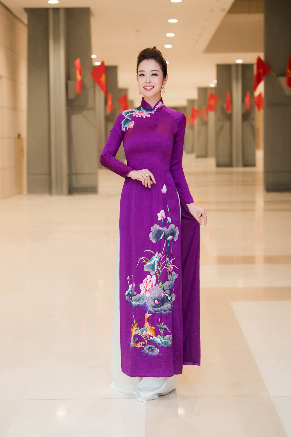 Người đẹp tiếp tục khoe sắc trong một tà áo dài tông màu tím, in họa tiết hoa sen thanh lịch.