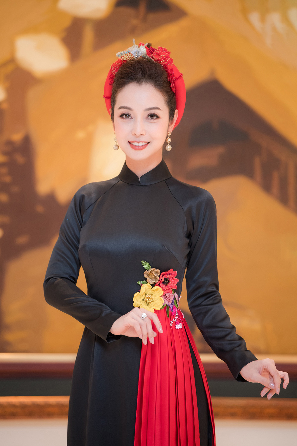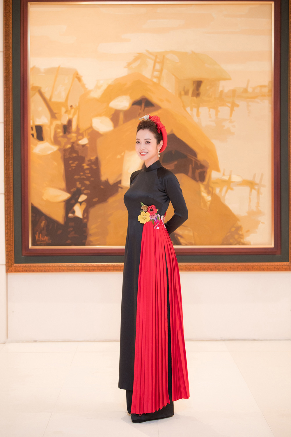 Bộ áo dài màu đen với điểm nhấn lạ mắt là vạt áo xếp ly màu đỏ đính ở phần eo khiến Jennifer nổi bật hơn.
