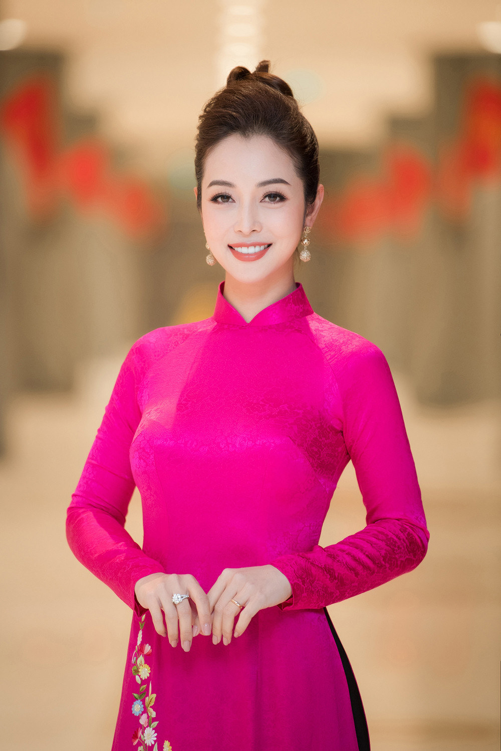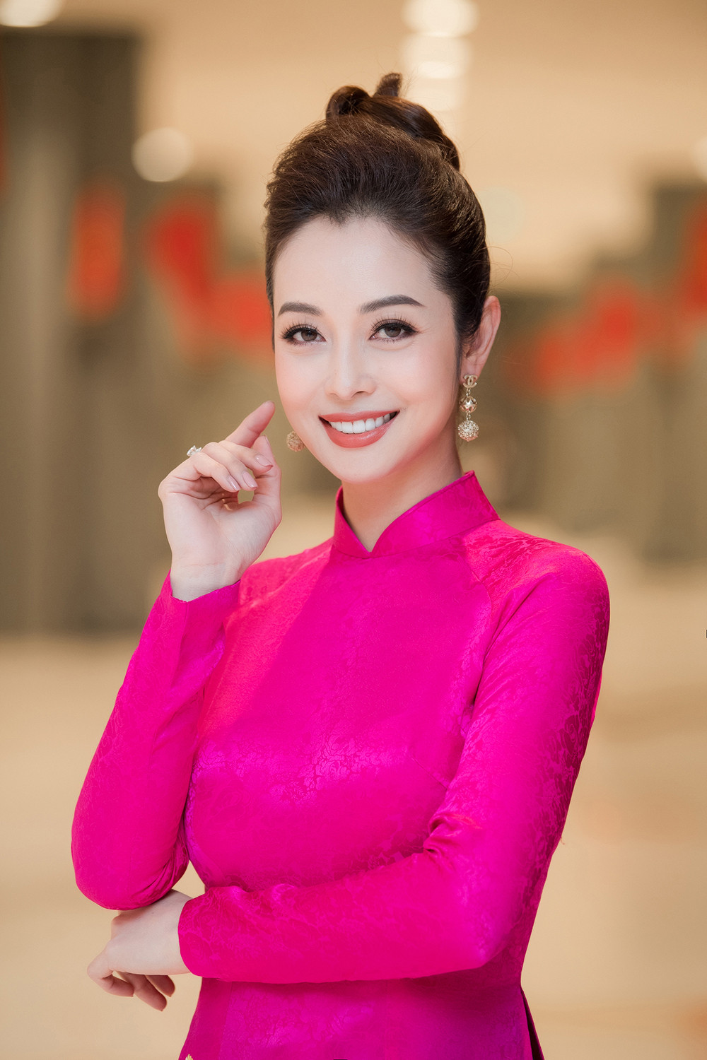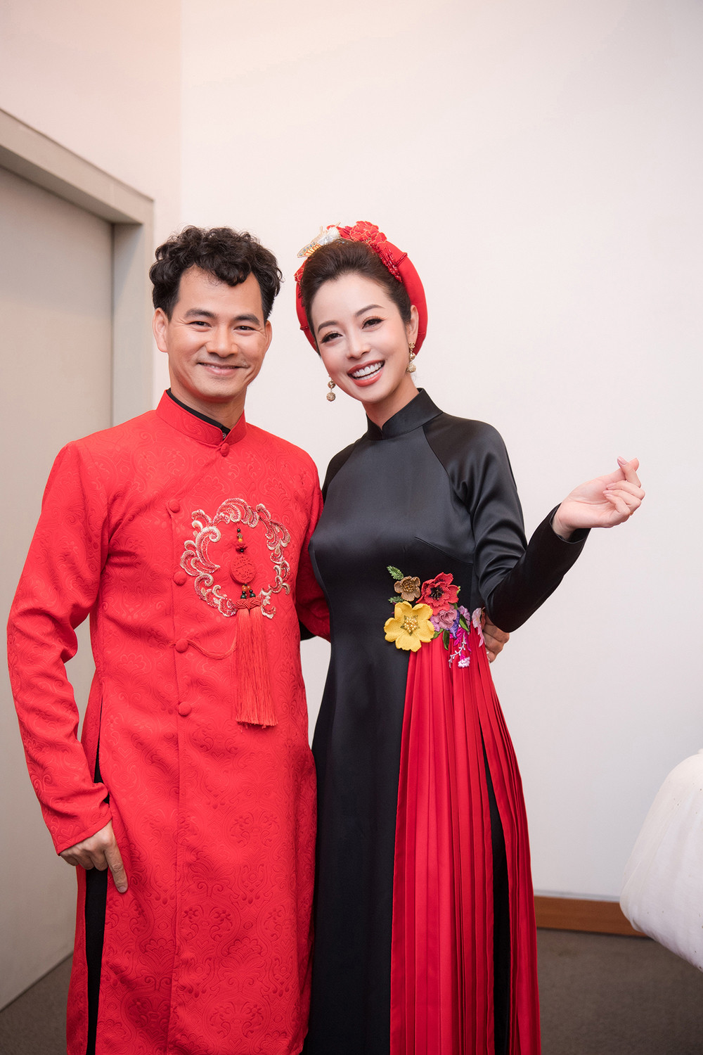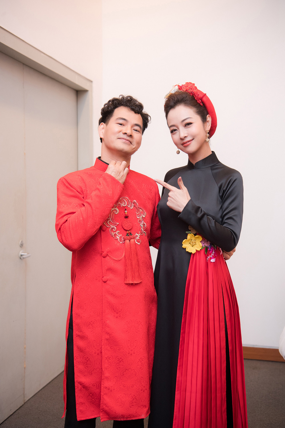 Jennifer đảm nhận vai trò MC cùng nghệ sĩ Xuân Bắc. Cả hai cùng diện áo dài tông màu đỏ rực mang không khí Tết.