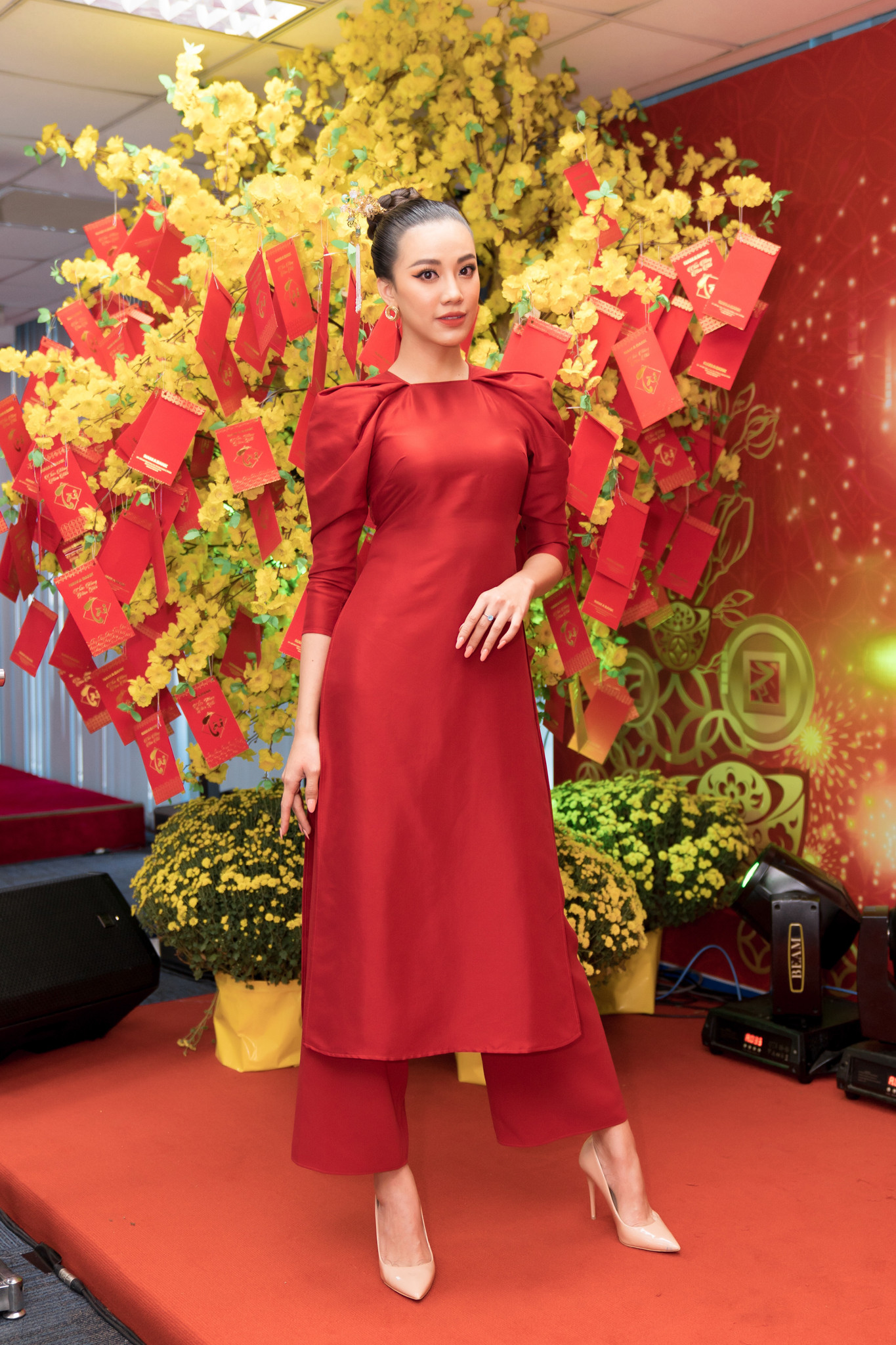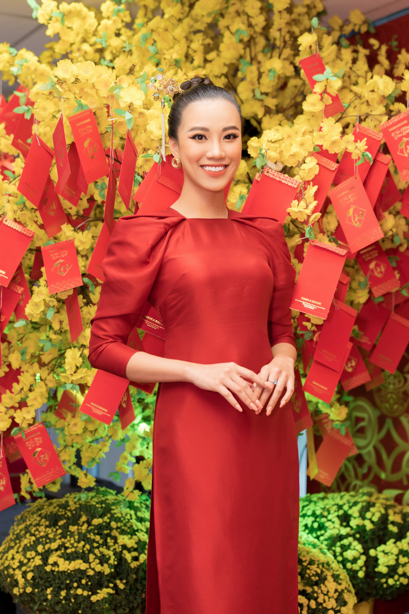 Á hậu Kim Duyên chọn bộ cánh màu đỏ kết hợp cùng phụ kiện trâm cài quyền quý.