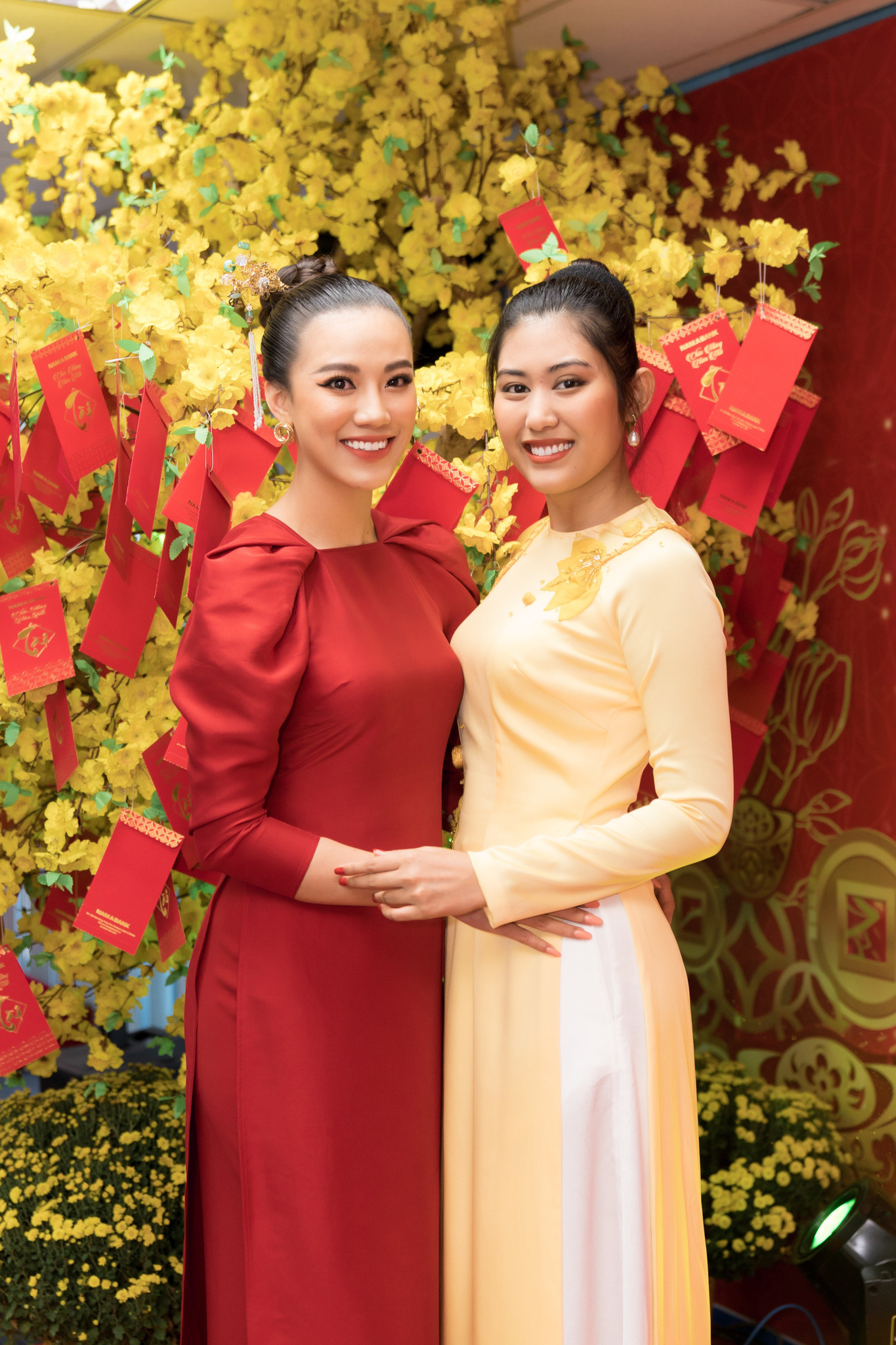 Khánh Vân khoe vai trần gợi cảm, Á hậu Kim Duyên mặc áo dài đỏ rực đầu năm mới