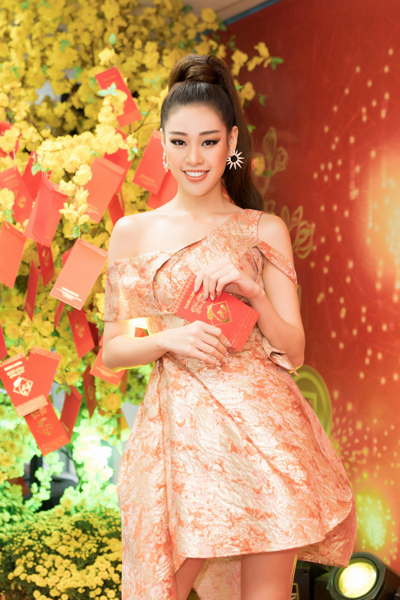 TPO - Hoa hậu Hoàn vũ Việt Nam 2019 Khánh Vân đeo lại đôi hoa tai may mắn trong đêm đăng quang cách đây không lâu để lấy hên đầu năm mới khi dự một sự kiện khai trương.
