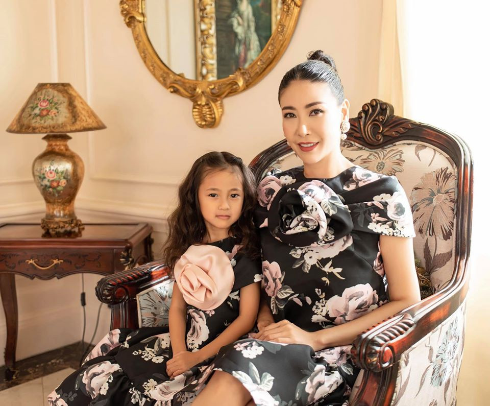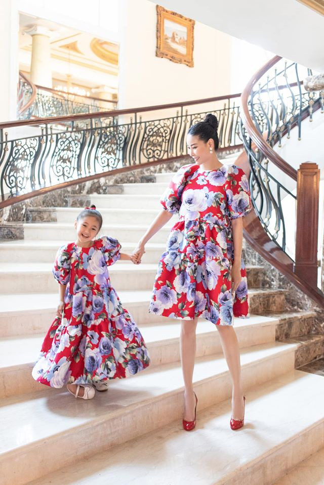 Hai mẹ con Hà Kiều Anh diện những trang phục hoạ tiết hoa vô cùng duyên dáng, đáng yêu.