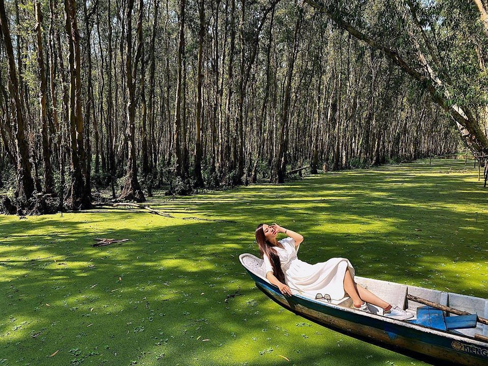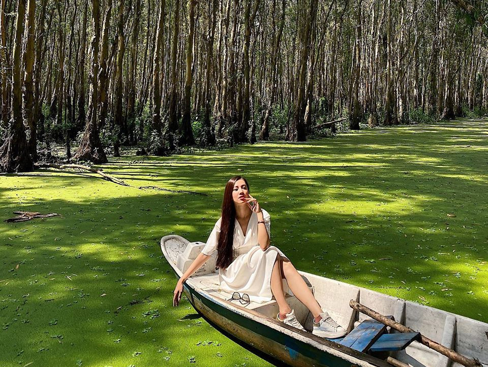 Người đẹp thả dáng thơ mộng trên thuyền khi đi chơi rừng.