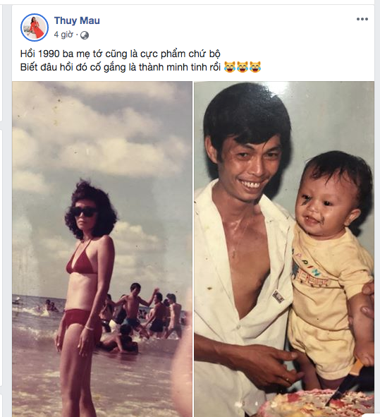 Á hậu Mâu Thuỷ hóm hỉnh khoe hình ảnh bố mẹ thời còn trẻ. Cô viết: "Hồi 1990 ba mẹ tớ cũng là cực phẩm chứ bộ. Biết đâu hồi đó cố gắng là thành minh tinh rồi".