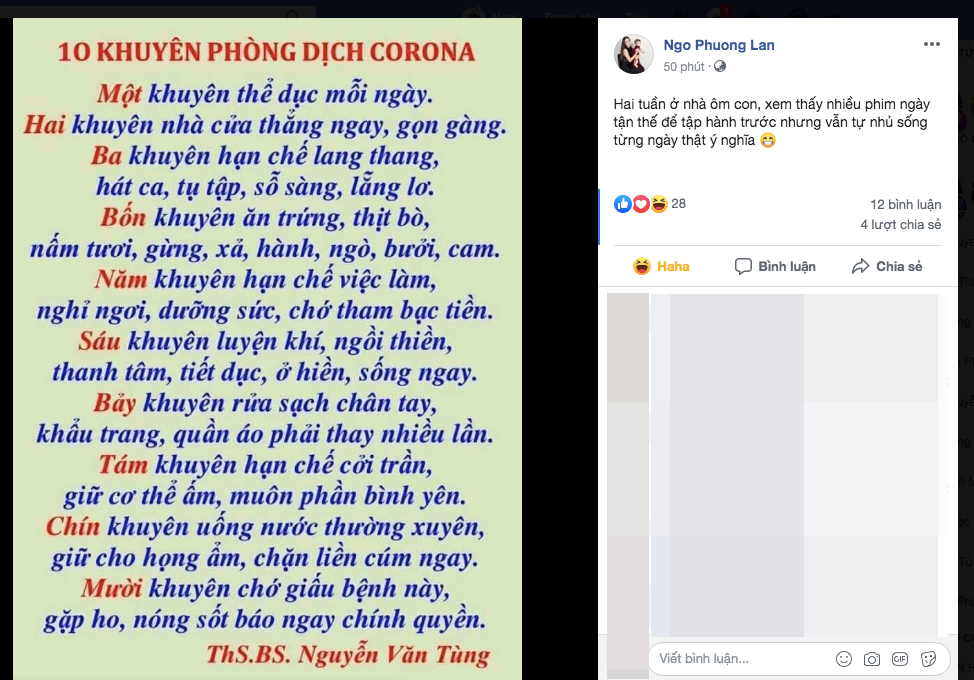 Hoa hậu Ngô Phương Lan chia sẻ bí quyết phòng dịch virus corona trên trang cá nhân nhận được nhiều lượt chia sẻ của các fans.