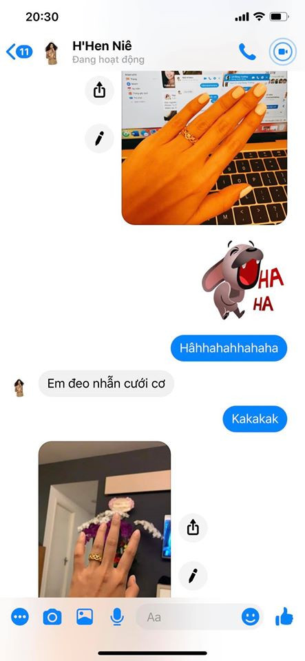 Hoa hậu Khánh Vân hóm hỉnh khoe đoạn chat của cô và Hoa hậu H'Hen Niê khi hai người đẹp phát hiện ra đeo nhẫn đôi.