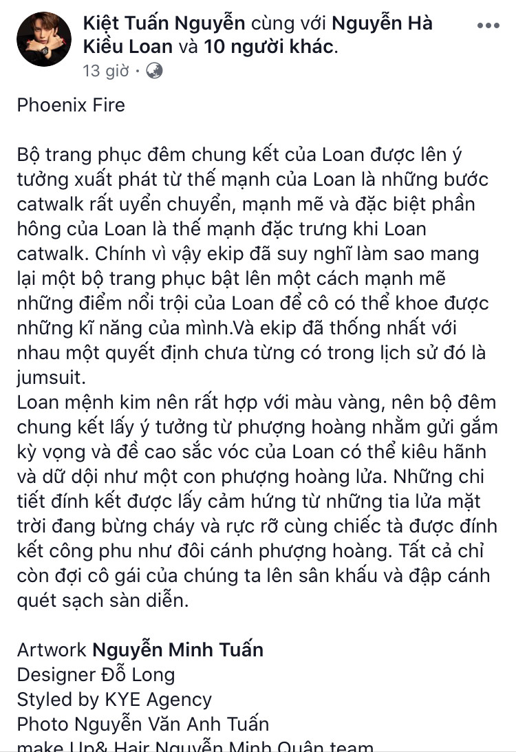 Trước khi Kiều Loan bước vào đêm thi bán kết, stylist Kye Nguyễn của cô cũng chia sẻ trên Facebook rằng: “Bộ trang phục Evening gown Loan vừa qua được lên ý tưởng xuất phát từ thế mạnh của Loan là những bước catwalk rất uyển chuyển, mạnh mẽ và đặc biệt phần hông của Loan là thế mạnh đặc trưng khi Loan catwalk. Chính vì vậy ekip đã suy nghĩ làm sao mang lại một bộ trang phục bật lên một cách mạnh mẽ những điểm nổi trội của Loan để cô có thể khoe được những kỹ năng của mình. Và ekip đã thống nhất với nhau một quyết định chưa từng có trong lịch sử đó là jumsuit.”