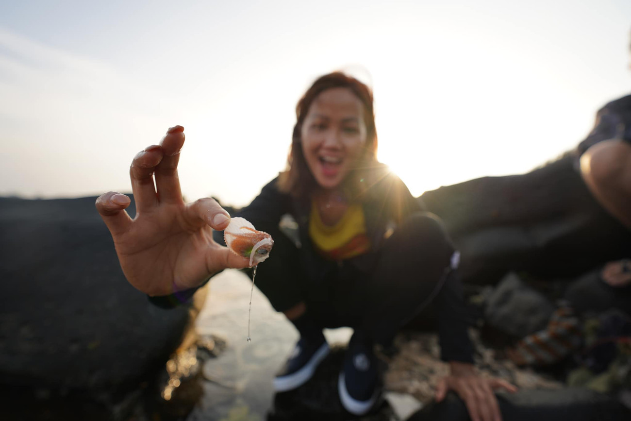 Hoa hậu H'Hen Niê thích thú khi được tham gia hoạt động bắt nghêu, sò, mực trên biển vào sáng sớm.