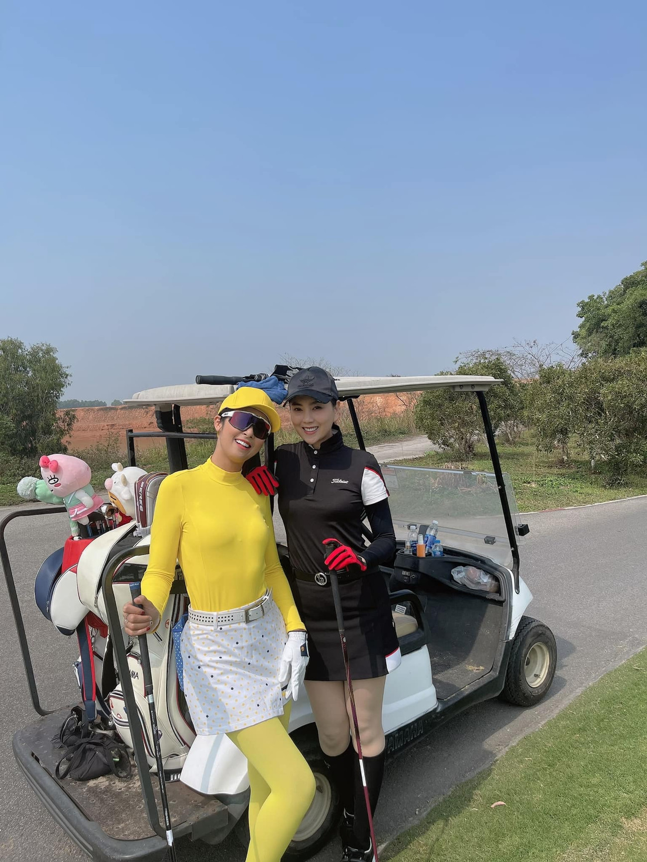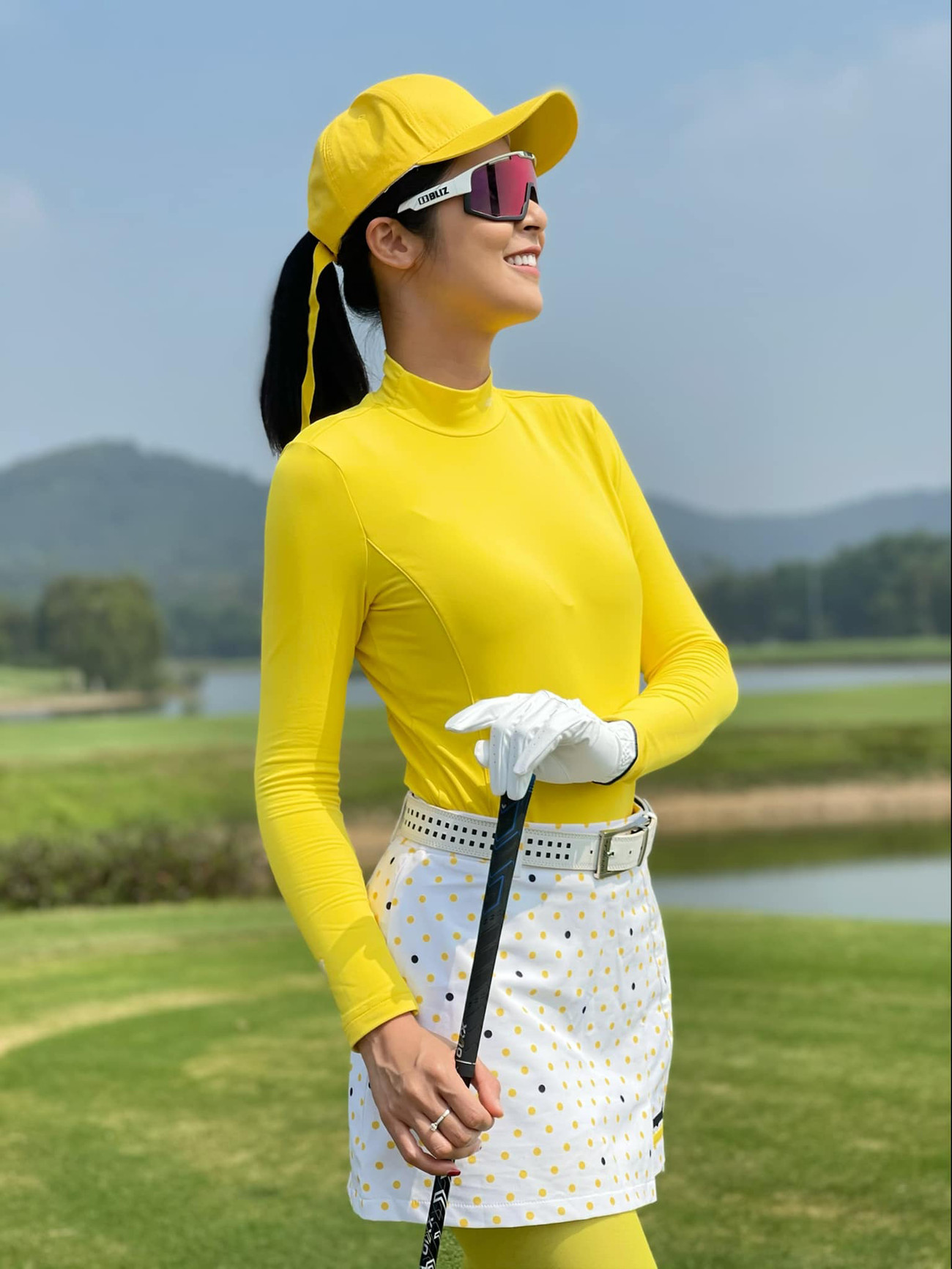 Hoa hậu Ngọc Hân nổi bật trên sân golf với bộ trang phục màu vàng rực rỡ.