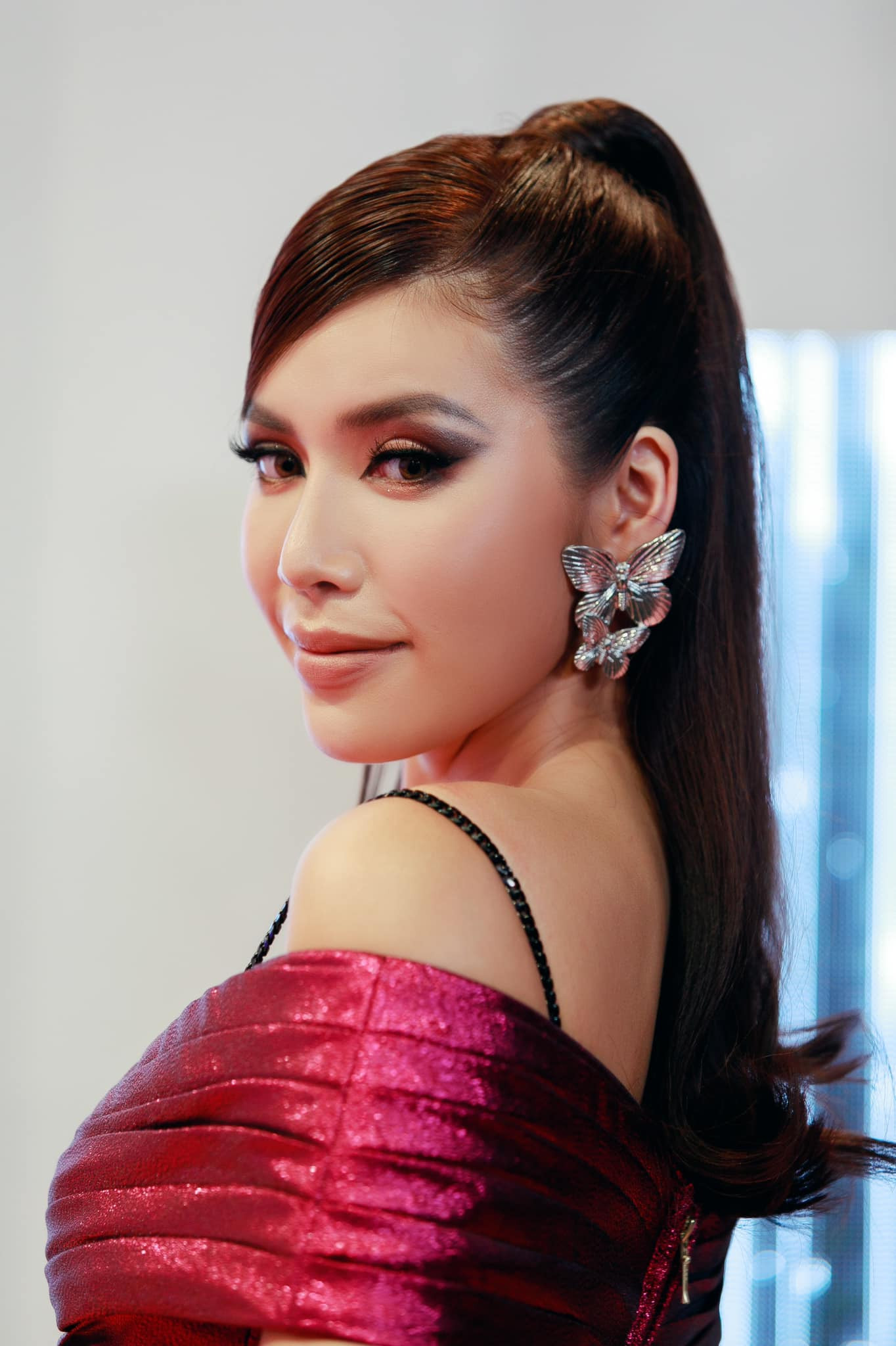 Người đẹp tạo điểm nhấn với đôi hoa tai hình con bướm.