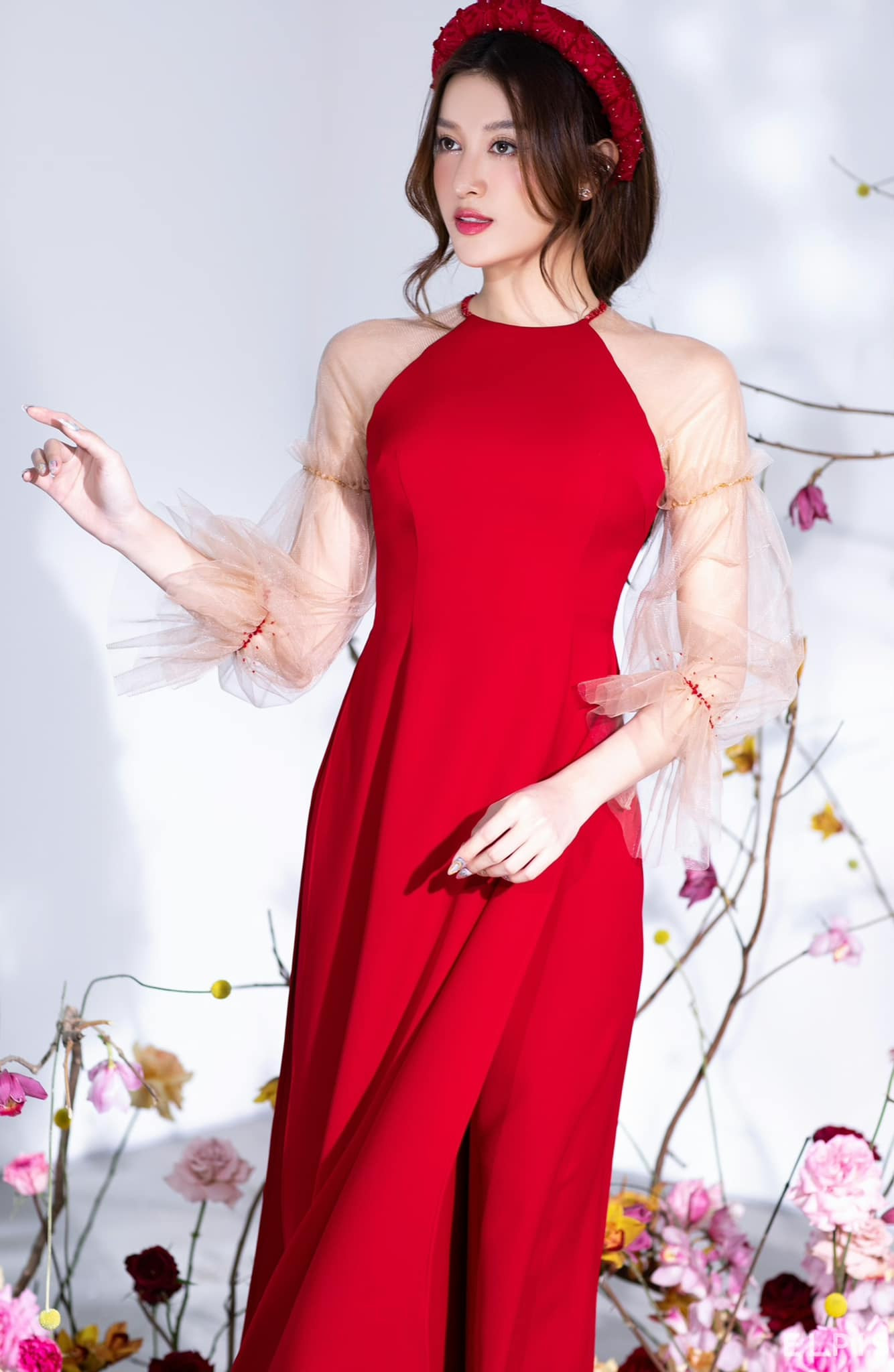 Á hậu Huyền My mang không khí Tết tới gần khi diện áo dài, khăn đóng màu đỏ rực.