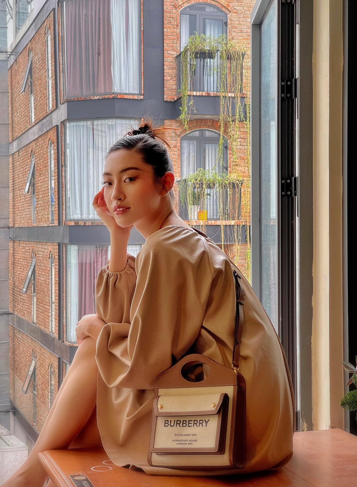 Hoa hậu Lương Thuỳ Linh giản dị mà vẫn xinh đẹp với tông màu nâu trầm.