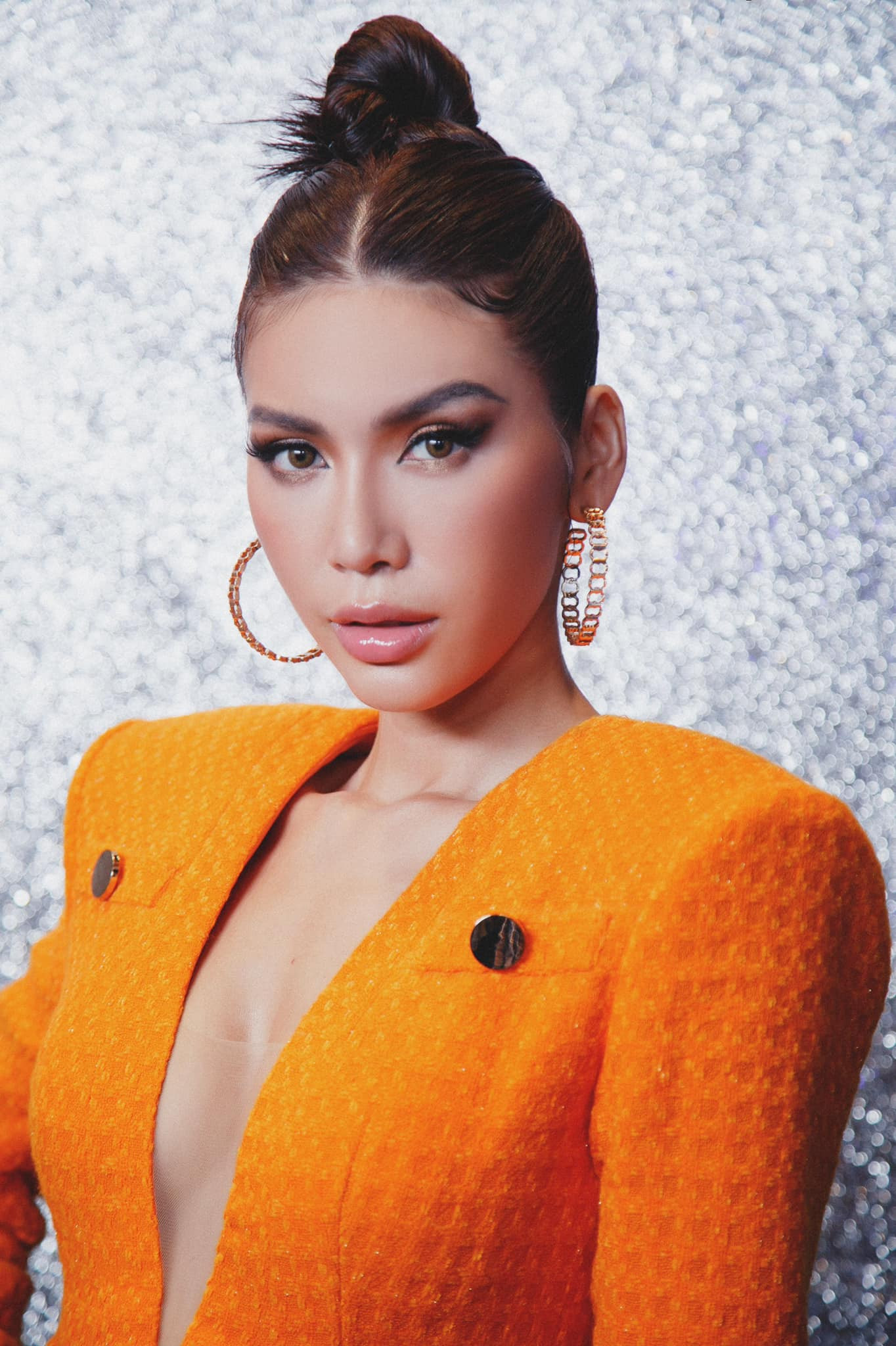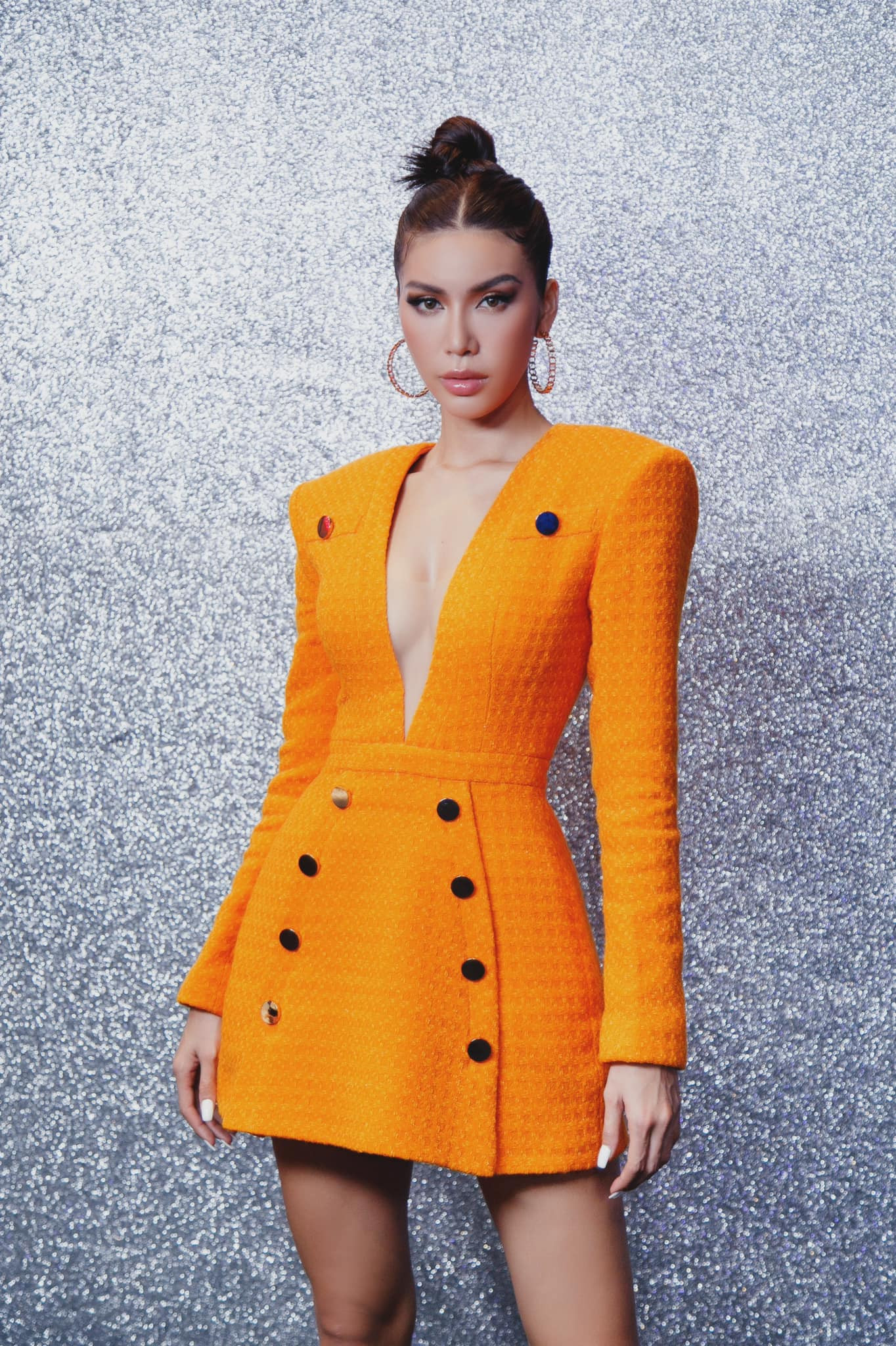 Siêu mẫu Minh Tú diện váy màu cam nổi bật, khoe vòng một cực kỳ nóng bỏng.