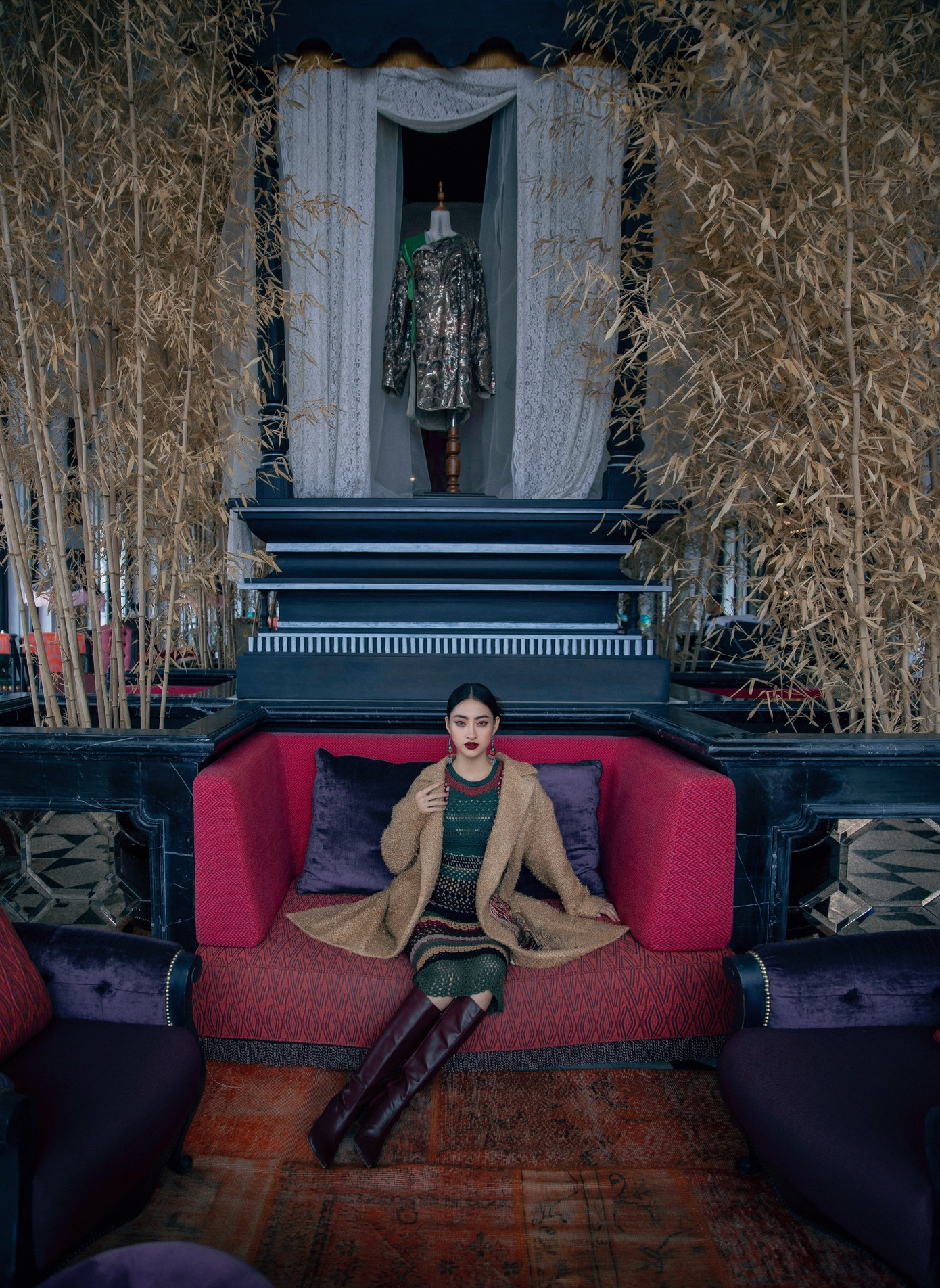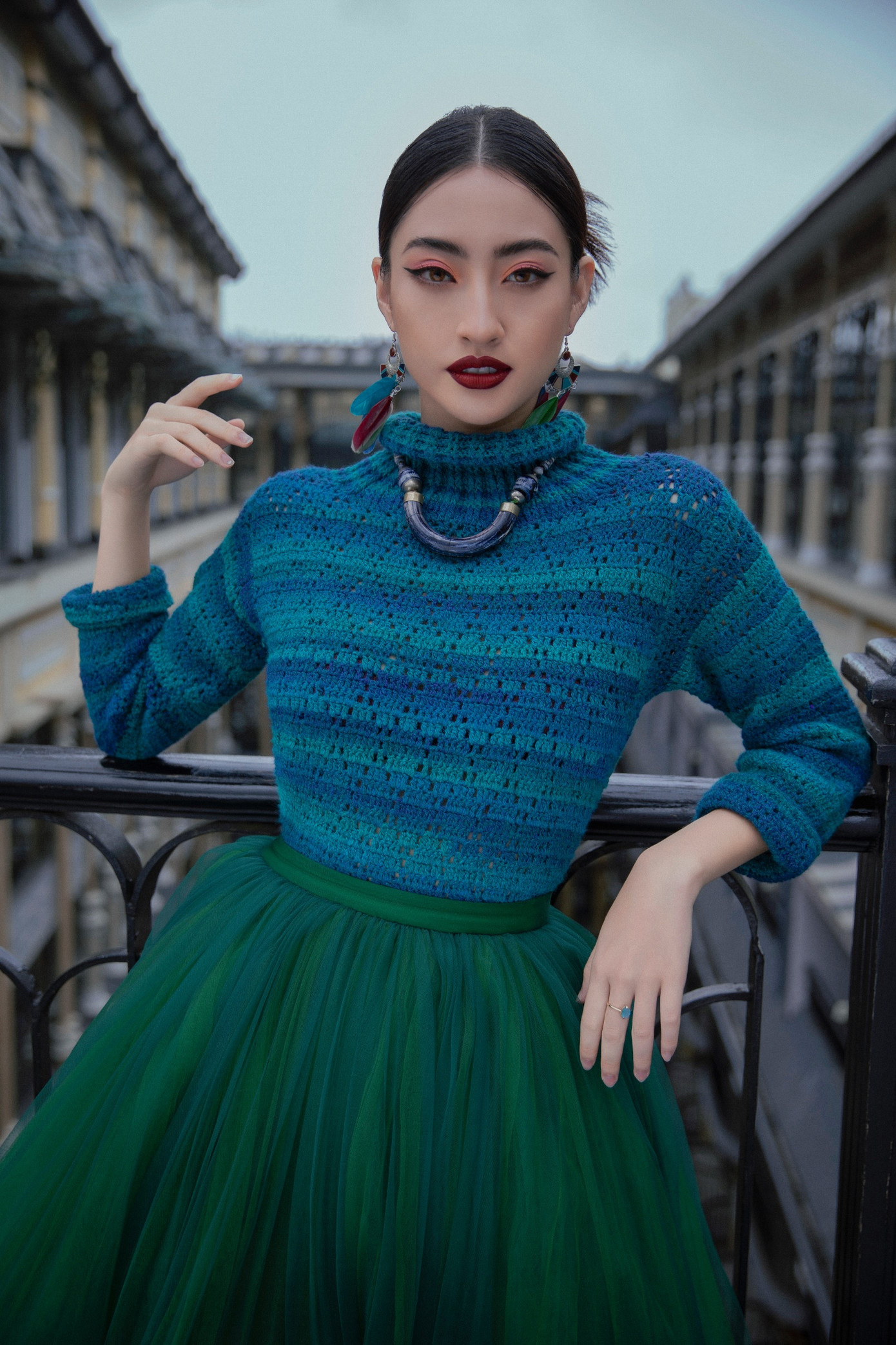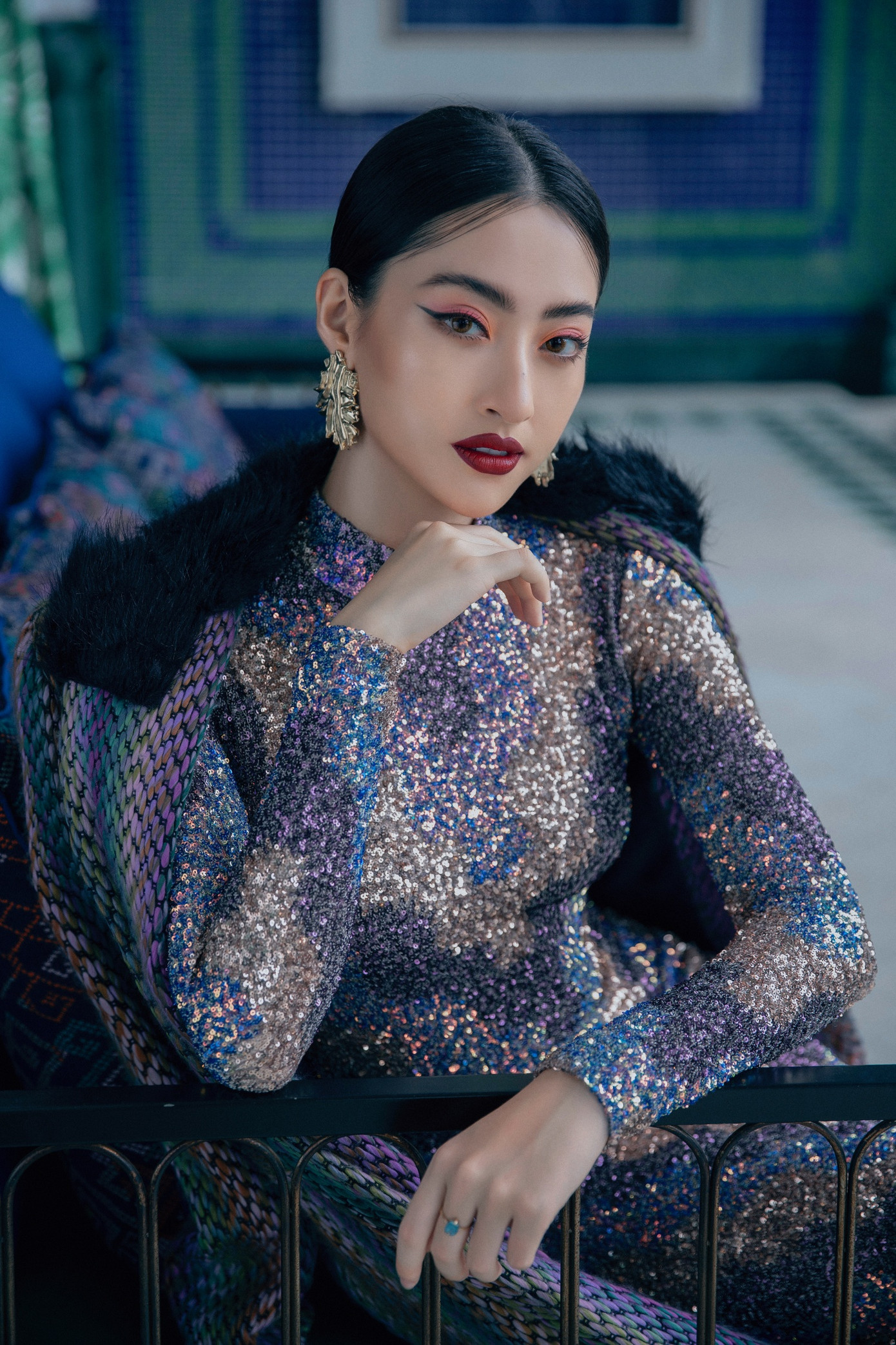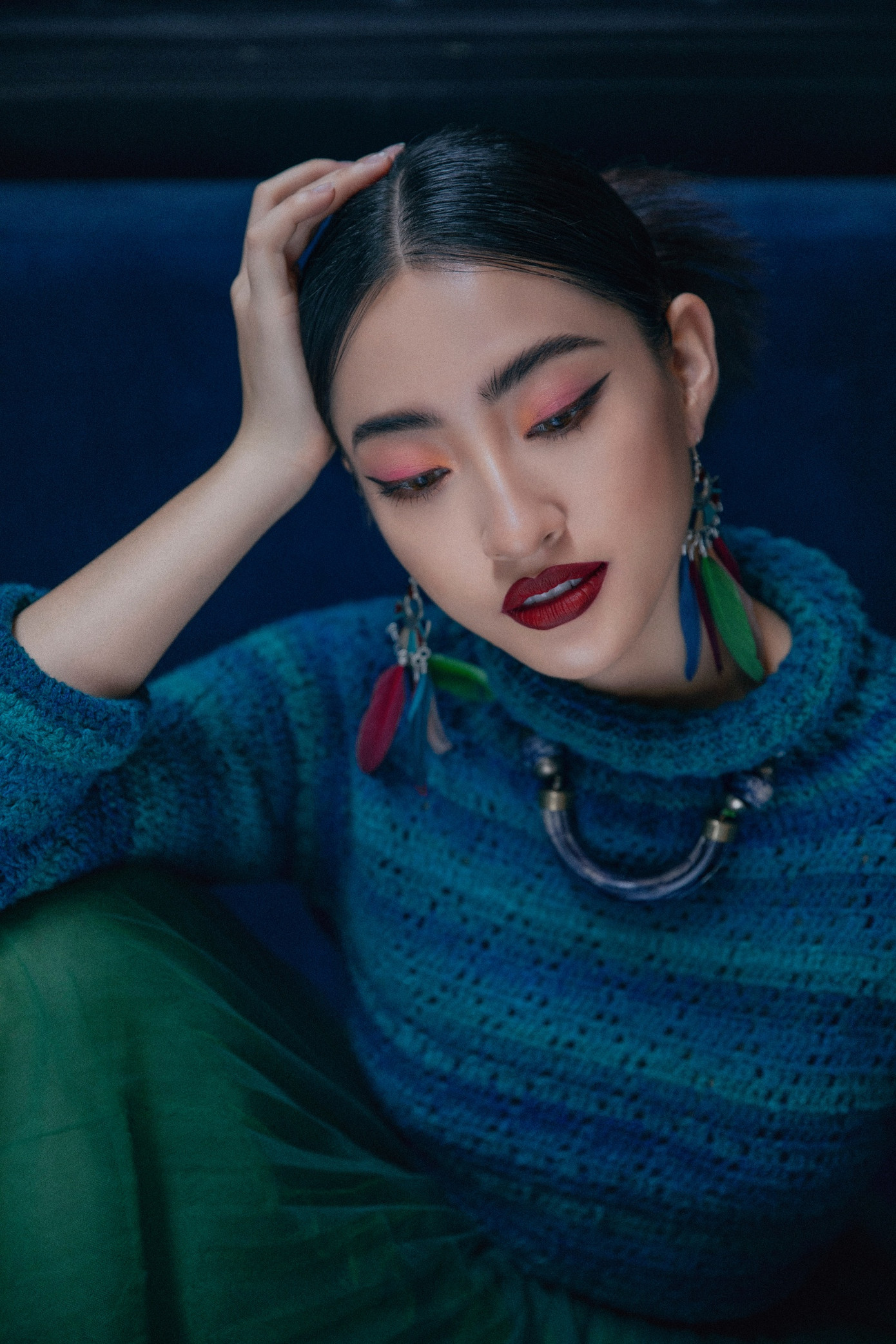 Trong bộ ảnh mới nhất, Lương Thuỳ Linh makeup tone đậm, trang phục cổ điển đa màu sắc.
