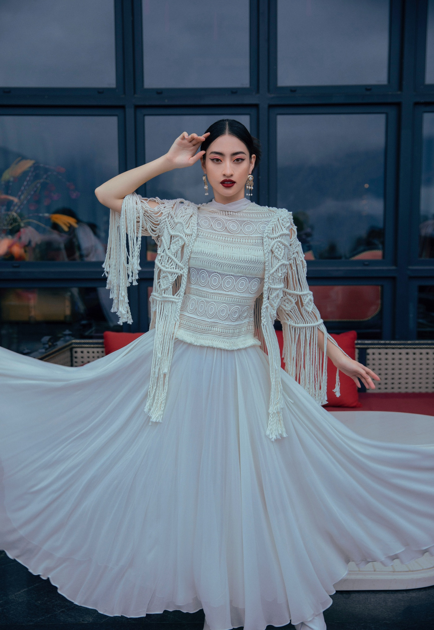 Trong trang phục của nhà thiết kế Lê Thanh Hoà, Lương Thuỳ Linh phô diễn đường cong gợi cảm cùng đôi chân dài 1m22 dài nhất V-biz.