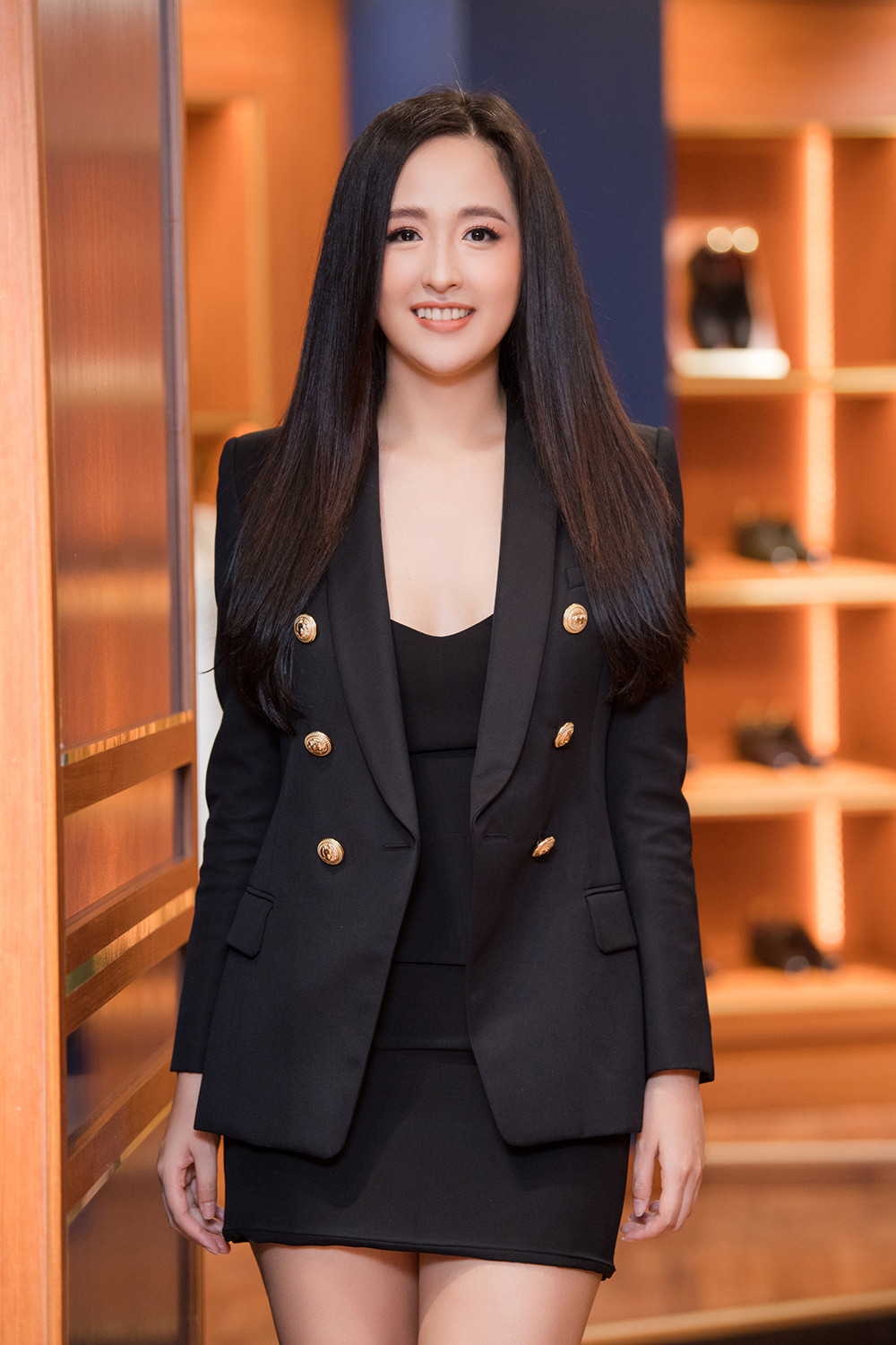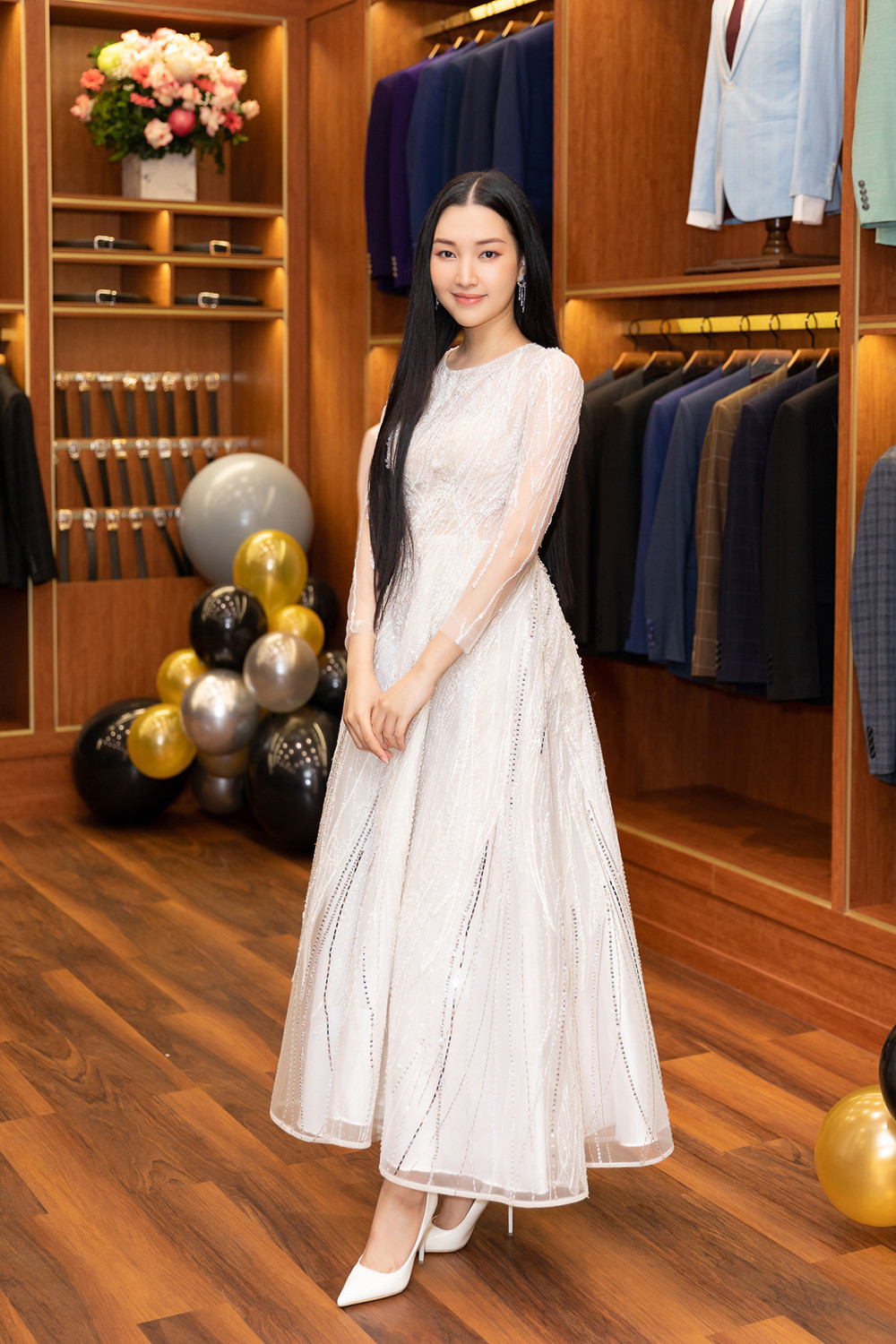Hoa hậu Tiểu Vy diện bộ suit màu trắng kín đáo, thanh lịch.
