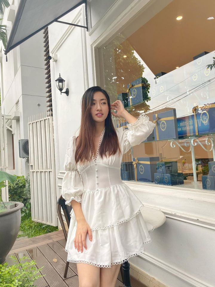 Hoa hậu Lương Thuỳ Linh diện váy trắng nữ tính, thanh lịch.