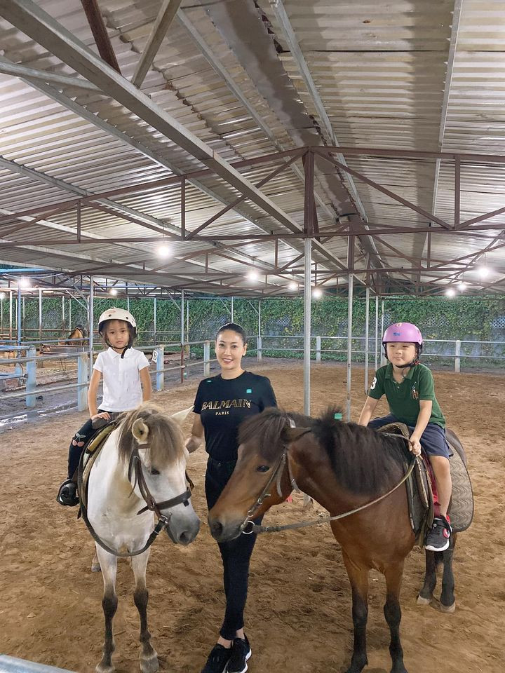 Hoa hậu Hà Kiều Anh đưa các con đi học cưỡi ngựa.