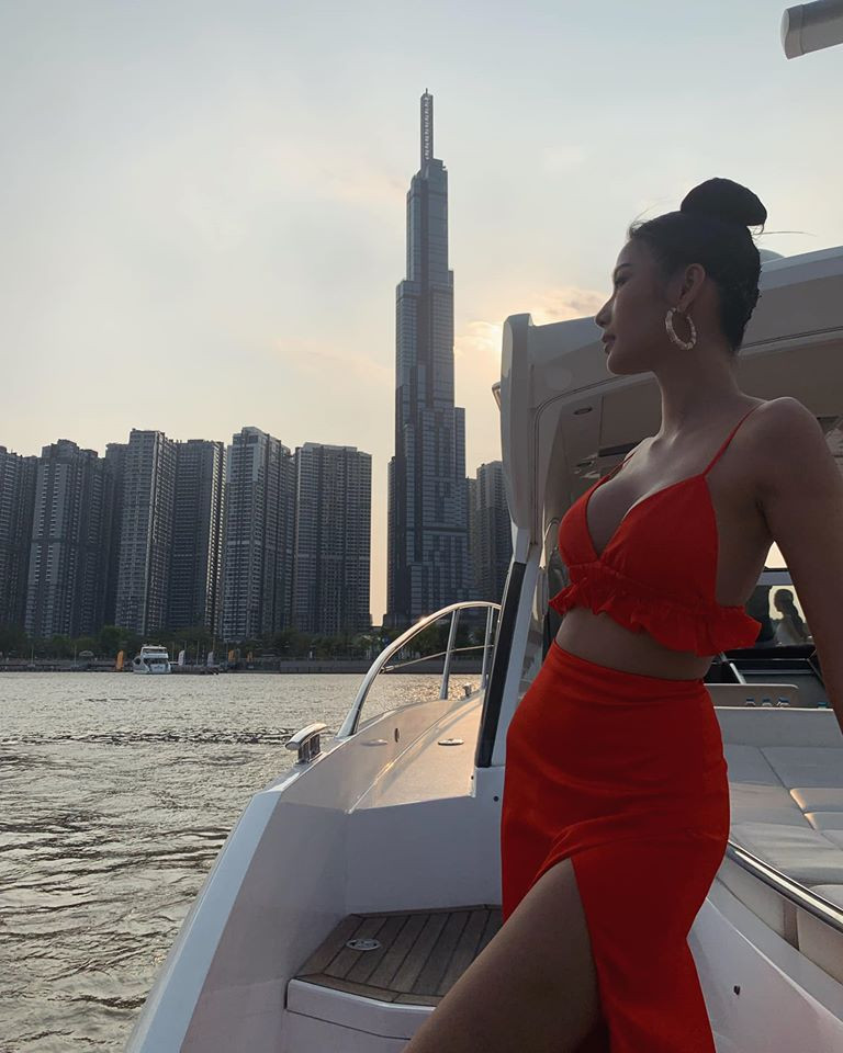 Á hậu Hoàng Thuỳ khoe dáng nóng bỏng trên du thuyền triệu đô với bộ váy đỏ rực.