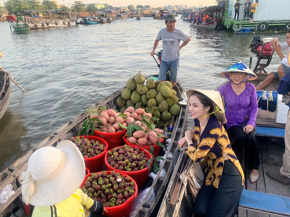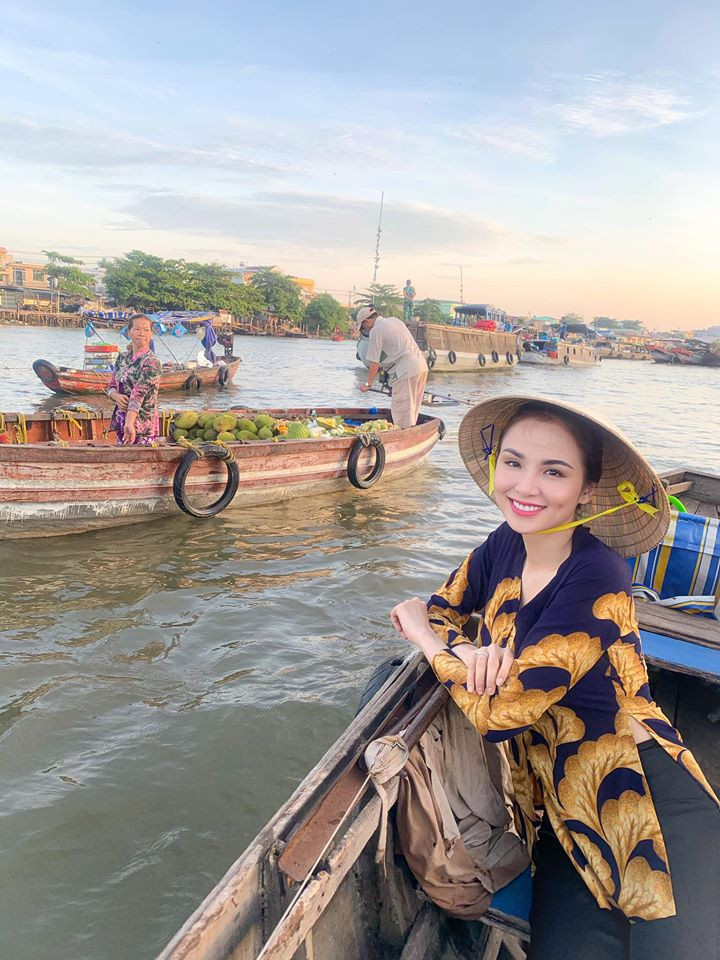 Hoa hậu Diễm Hương thả dáng trên thuyền khi đi chợ nổi miền Tây.
