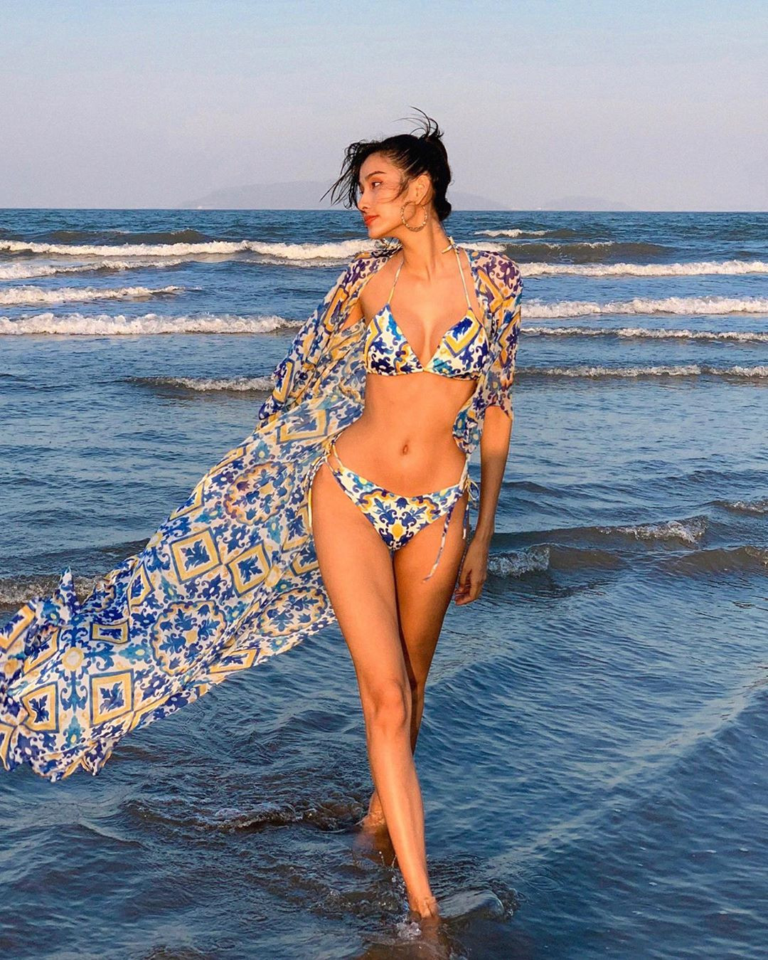 Á hậu Hoàng Thuỳ khoe dáng cực quyến rũ trên biển với bộ bikini hoạ tiết lãng mạn, bay bổng.