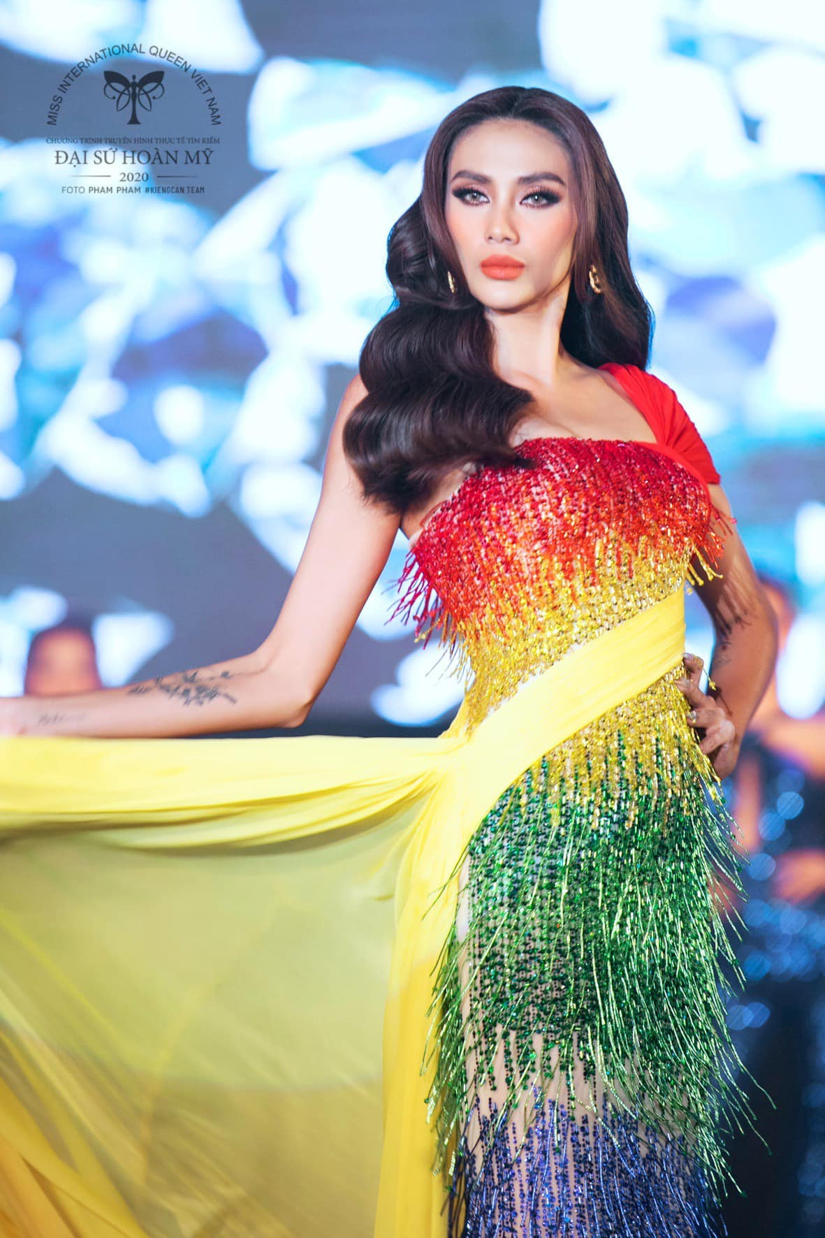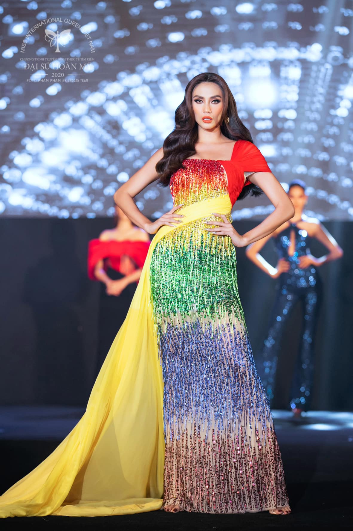 Siêu mẫu, Á hậu Võ Hoàng Yến nổi bật trong bộ váy dạ hội lục sắc để ủng hộ cộng đồng LGBT.