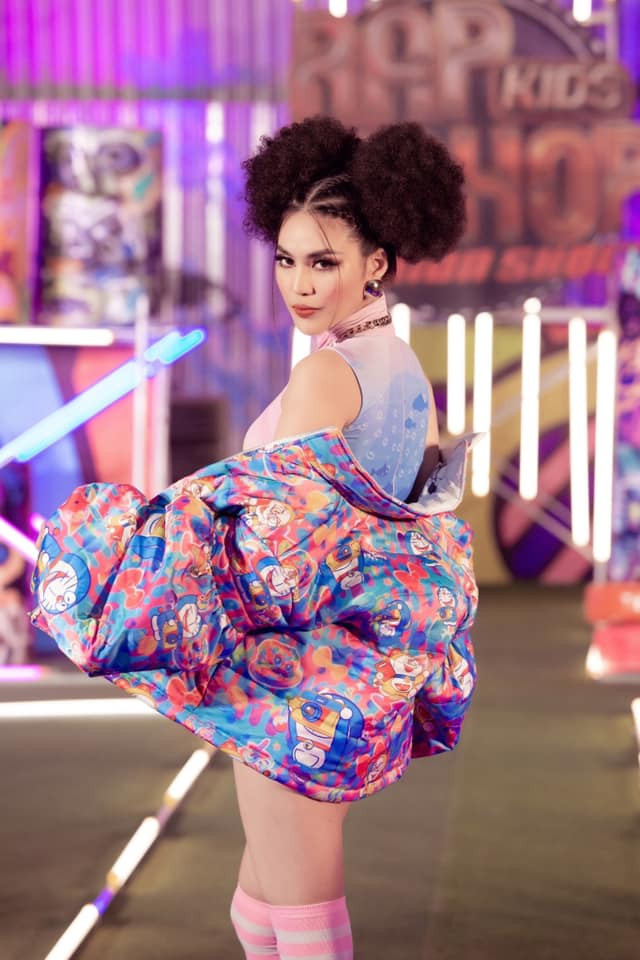 Người đẹp còn gây chú ý với mái tóc độc đáo và chiếc áo khoác hoạ tiết Đô Rê Mon dễ thương.