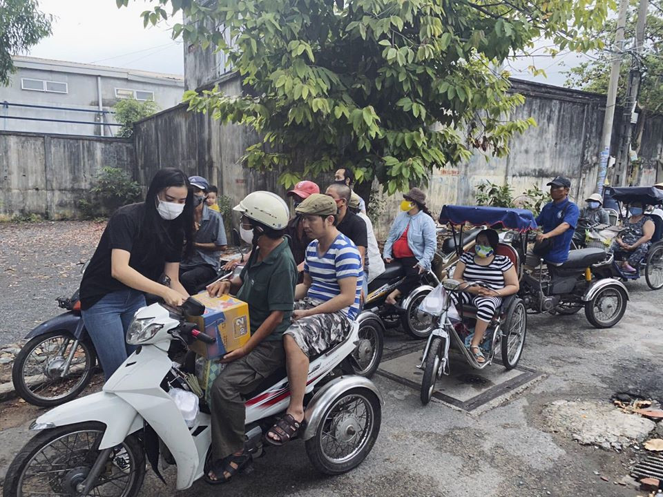 Á hậu Kim Duyên tiếp tục tặng quà cho những người bán vé số trong mùa dịch.