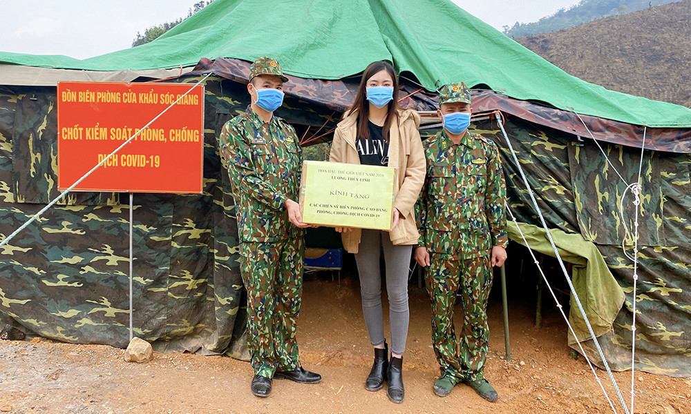 Ngày 9/4, Hoa hậu thế giới Việt Nam 2019 Lương Thùy Linh đến thăm, tặng quà các chiến sĩ bộ đội biên phòng đang làm nhiệm vụ phòng chống dịch Covid-19 tại khu vực biên giới Việt - Trung.