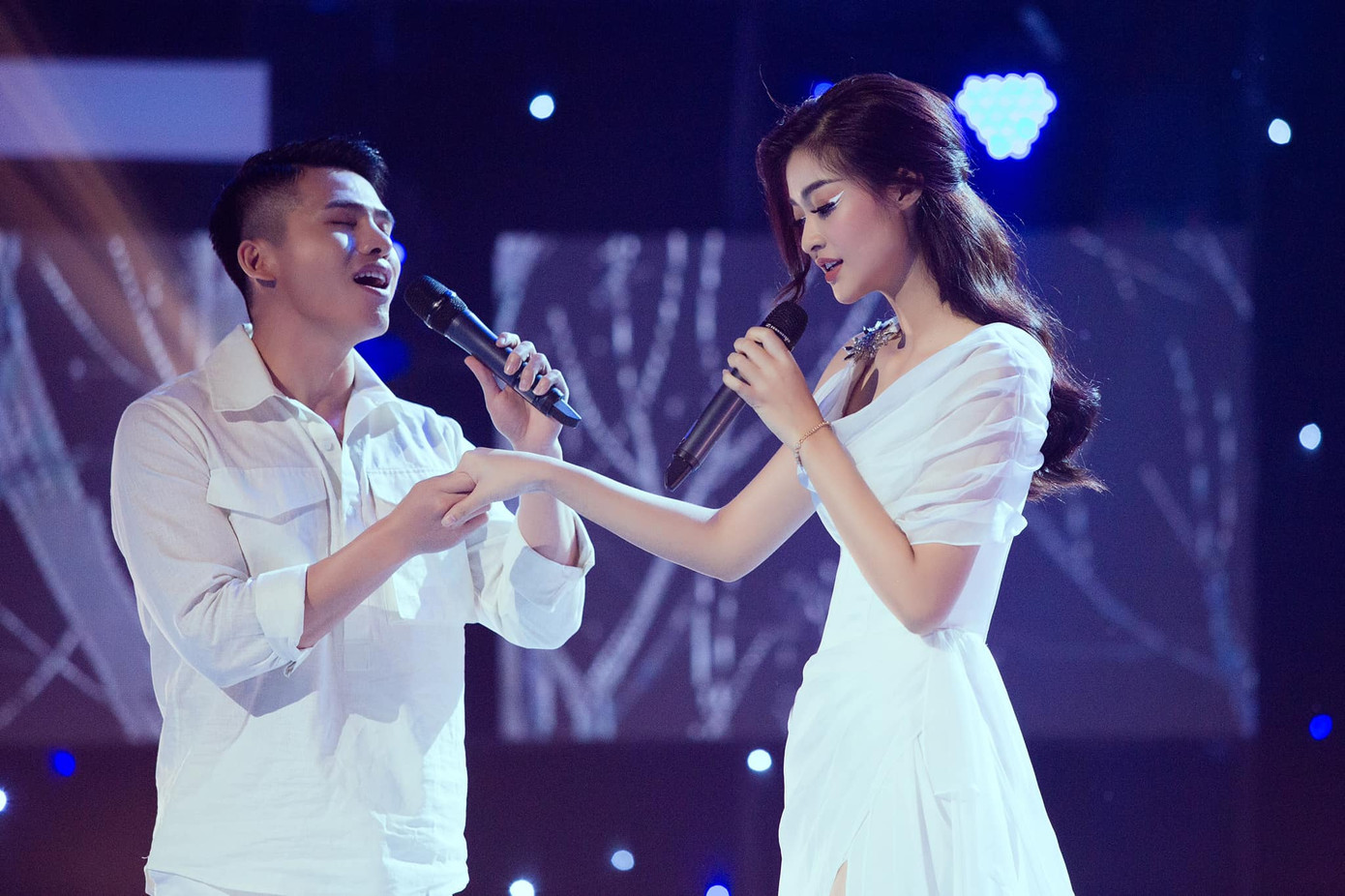 Á hậu Kiều Loan song ca cùng ca sĩ Quốc Thiên trên sân khẩu 'Trời sinh một cặp'.