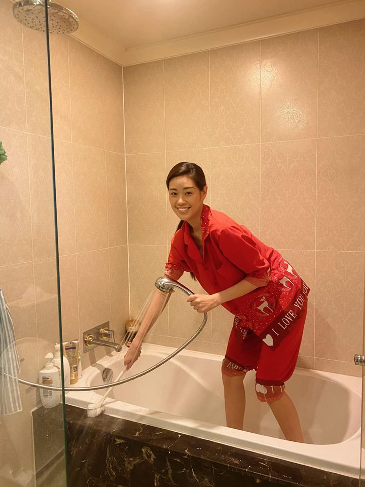 Hoa hậu Khánh Vân dọn dẹp bồn tắm trong những ngày ở nhà cách ly.