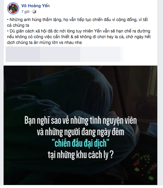 Bản tin Hoa hậu 24/4: Ngày đầu thực hiện nới lỏng giãn cách xã hội, siêu mẫu Võ Hoàng Yến đã 'đăng đàn' để kêu gọi các fans tiếp tục nghiêm chỉnh chấp hành các quy định phòng chống dịch COVID-19. "Dù giãn cách xã hội đã được nới lỏng tuy nhiên Yến vẫn sẽ hạn chế ra đường nếu không có công việc cần thiết và sẽ không đi chơi hay la cà, chờ ngày hết dịch chúng ta ăn mừng lớn với nhau nha" - cô viết.