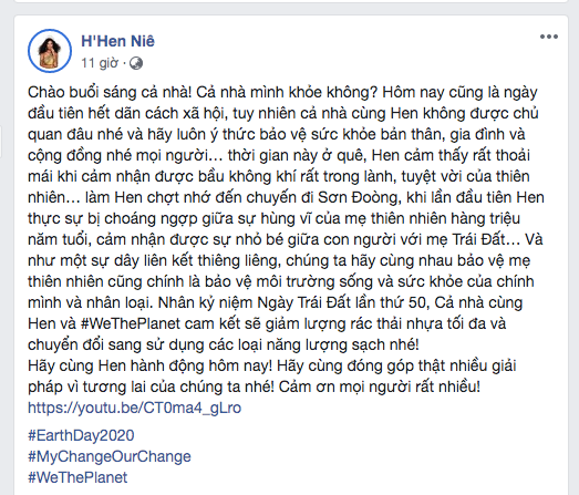 Trong khi đó Hoa hậu H'Hen Niê cũng kêu gọi các fans chấp hành quy định về chống dịch, đồng thời cùng chung tay bảo vệ môi trường trong Ngày Trái Đất. Cô viết: "Chào buổi sáng cả nhà! Cả nhà mình khỏe không? Hôm nay cũng là ngày đầu tiên hết dãn cách xã hội, tuy nhiên cả nhà cùng Hen không được chủ quan đâu nhé và hãy luôn ý thức bảo vệ sức khỏe bản thân, gia đình và cộng đồng nhé mọi người…".