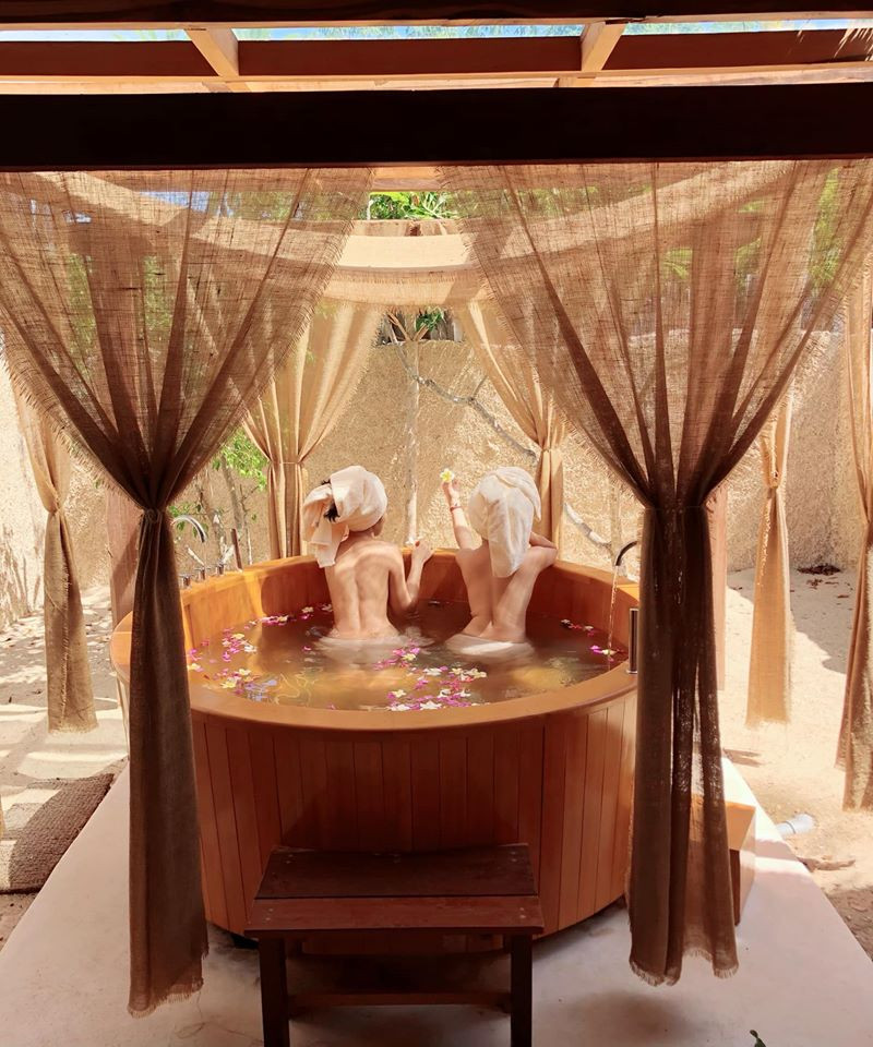 Tận hưởng cảm giác tắm bồn bên trong khu nghỉ dưỡng, người đẹp không ngần ngại bán nude, khoe lưng trần nuột nà và quyến rũ.