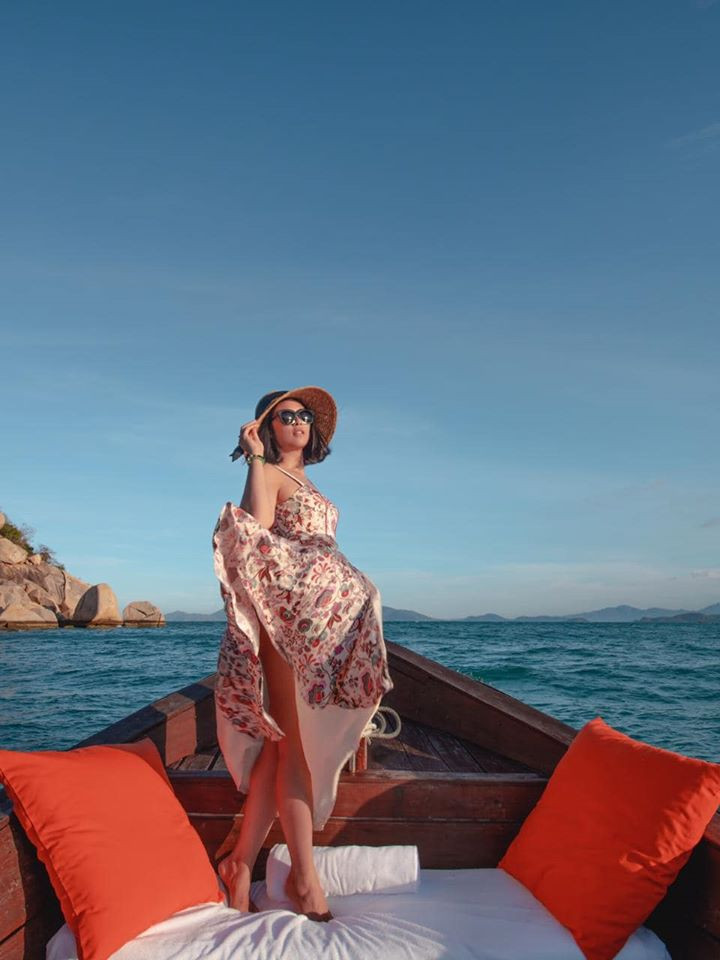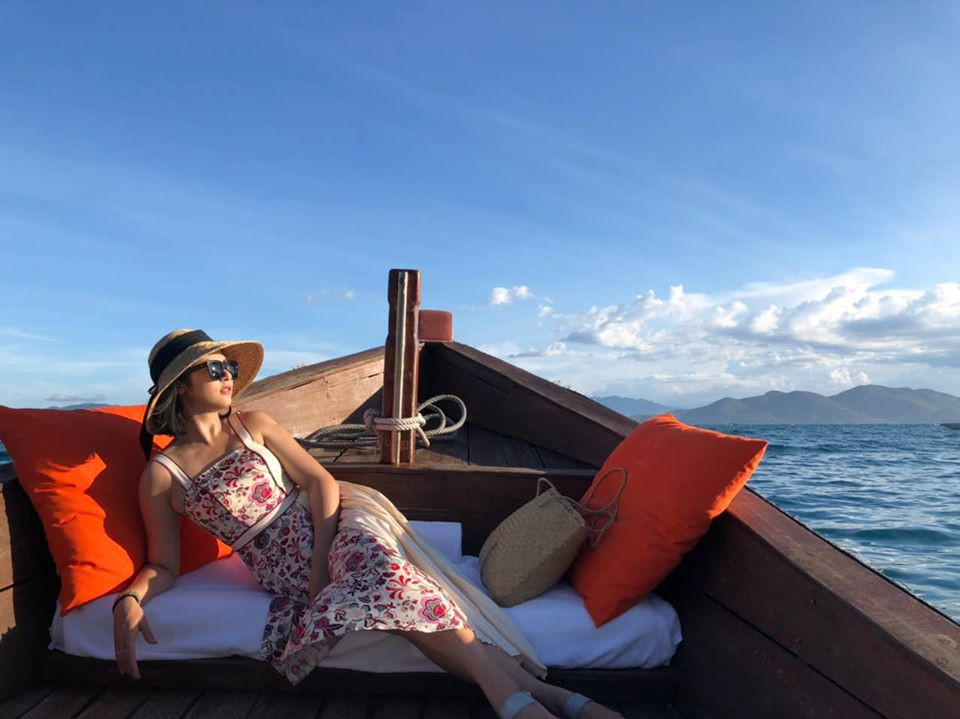 Mới đây Hoa hậu Ngọc Hân có chuyến nghỉ dưỡng tại một khu resort nổi tiếng ở Nha Trang. Người đẹp mặc váy hoạ tiết hoa quyến rũ ngồi trên du thuyền ngắm cảnh biển.