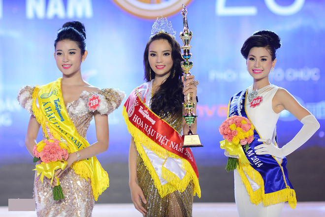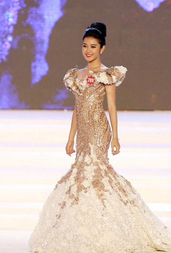 Bộ váy dạ hội lộng lẫy, cầu kỳ này cũng góp phần giúp người đẹp giành giải Á hậu 1 tại Hoa hậu Việt Nam 2014.