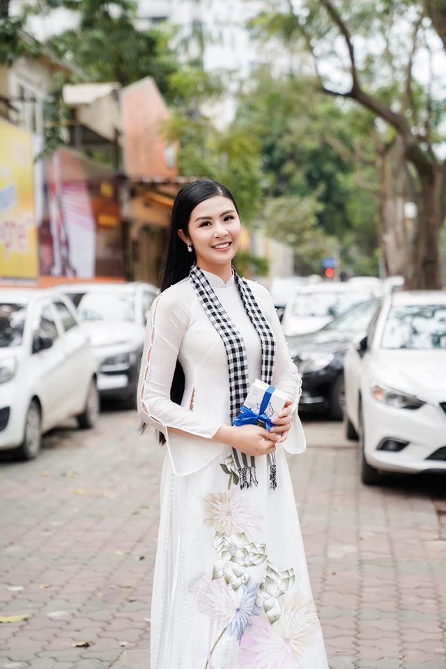 Hoa hậu Ngọc Hân rạng rỡ áo dài khi đi tặng sách.