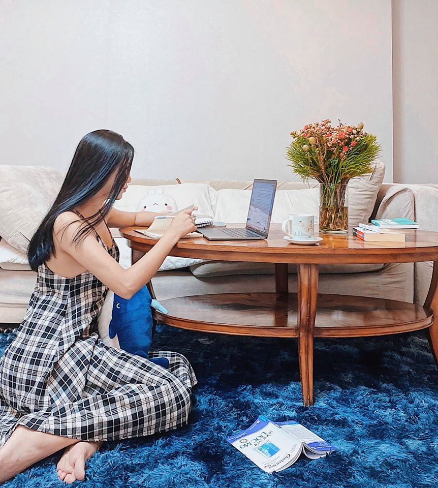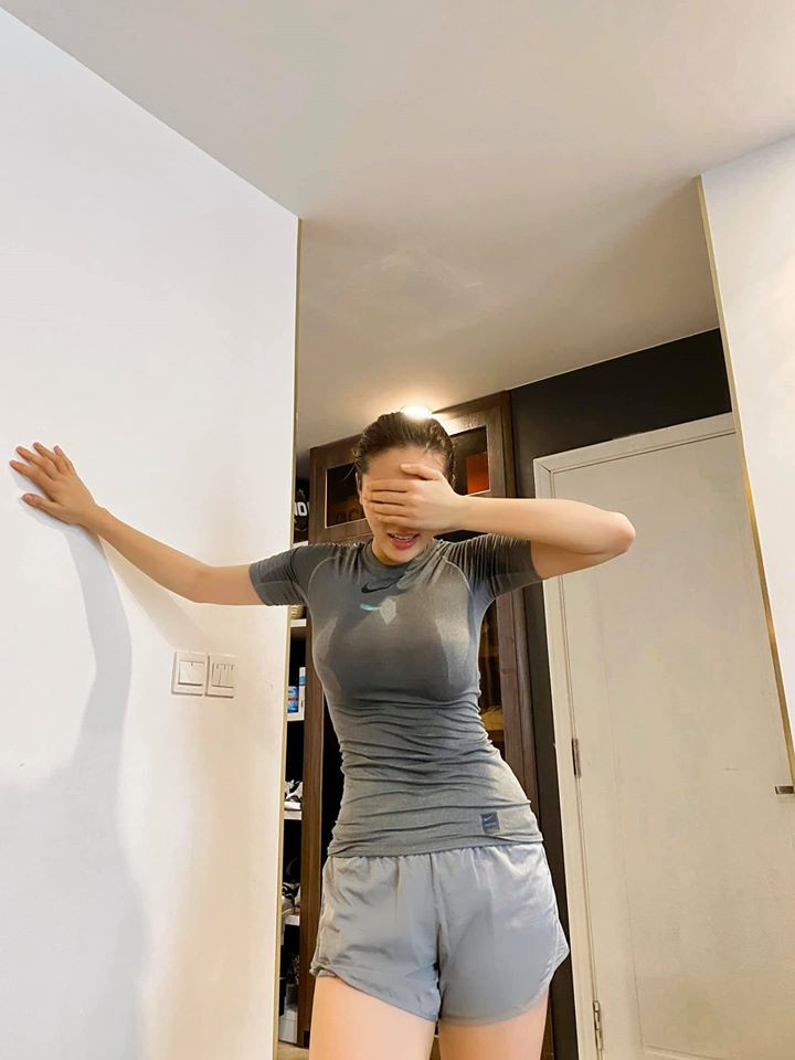 Hoa hậu Kỳ Duyên tranh thủ tập thể dục ở trong nhà.
