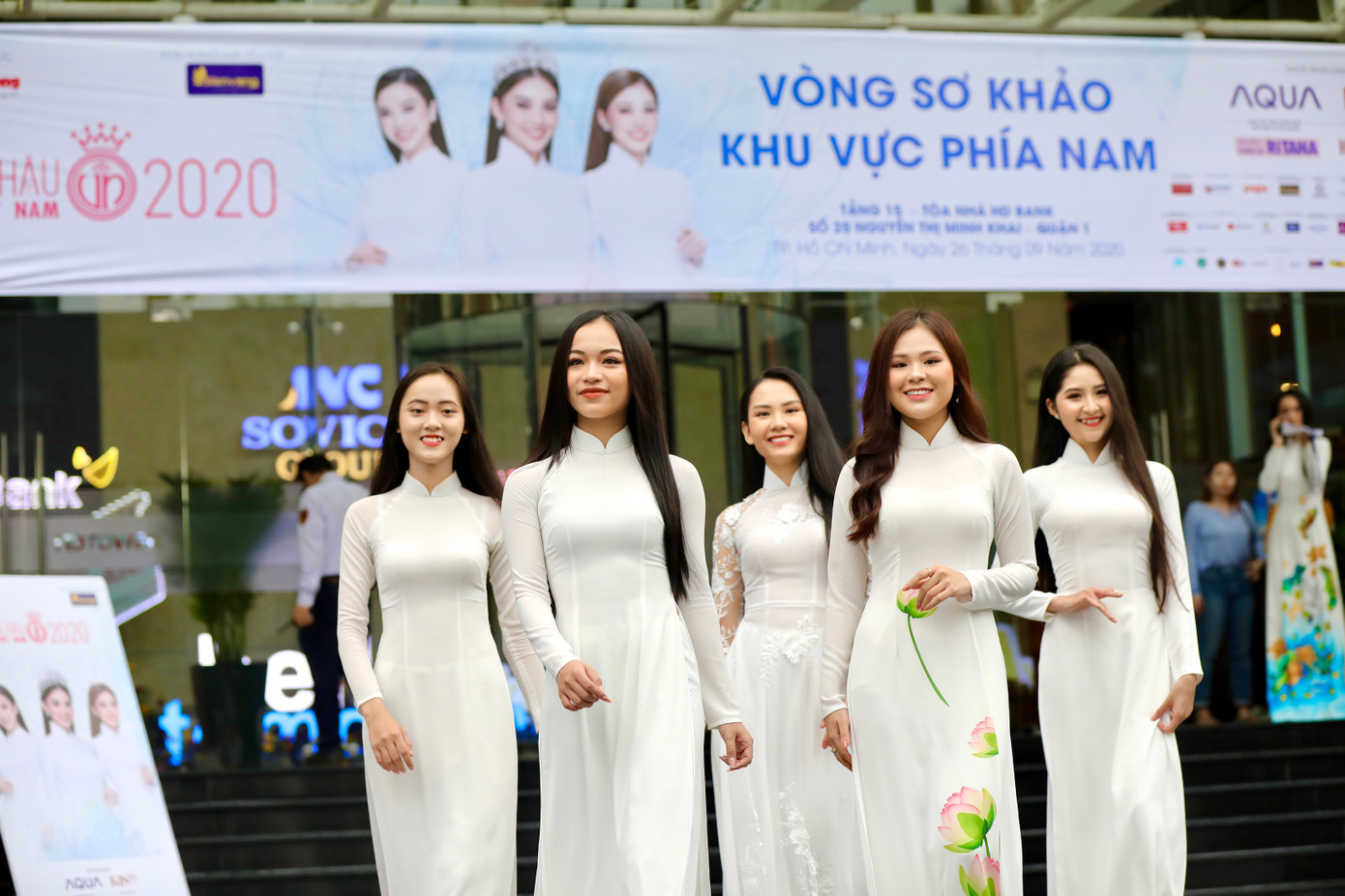Tòa nhà HD Bank, Nguyễn Thị Minh Khai, quận 1, TPHCM sinh sắc hơn ngày thường. Từ sáng sớm 26/9, từng nhóm người đẹp thướt tha, phục sức đa dạng nào áo dài trắng tinh khôi, nào đầm dạ hội khéo khoe làn da trắng và vòng eo thon.