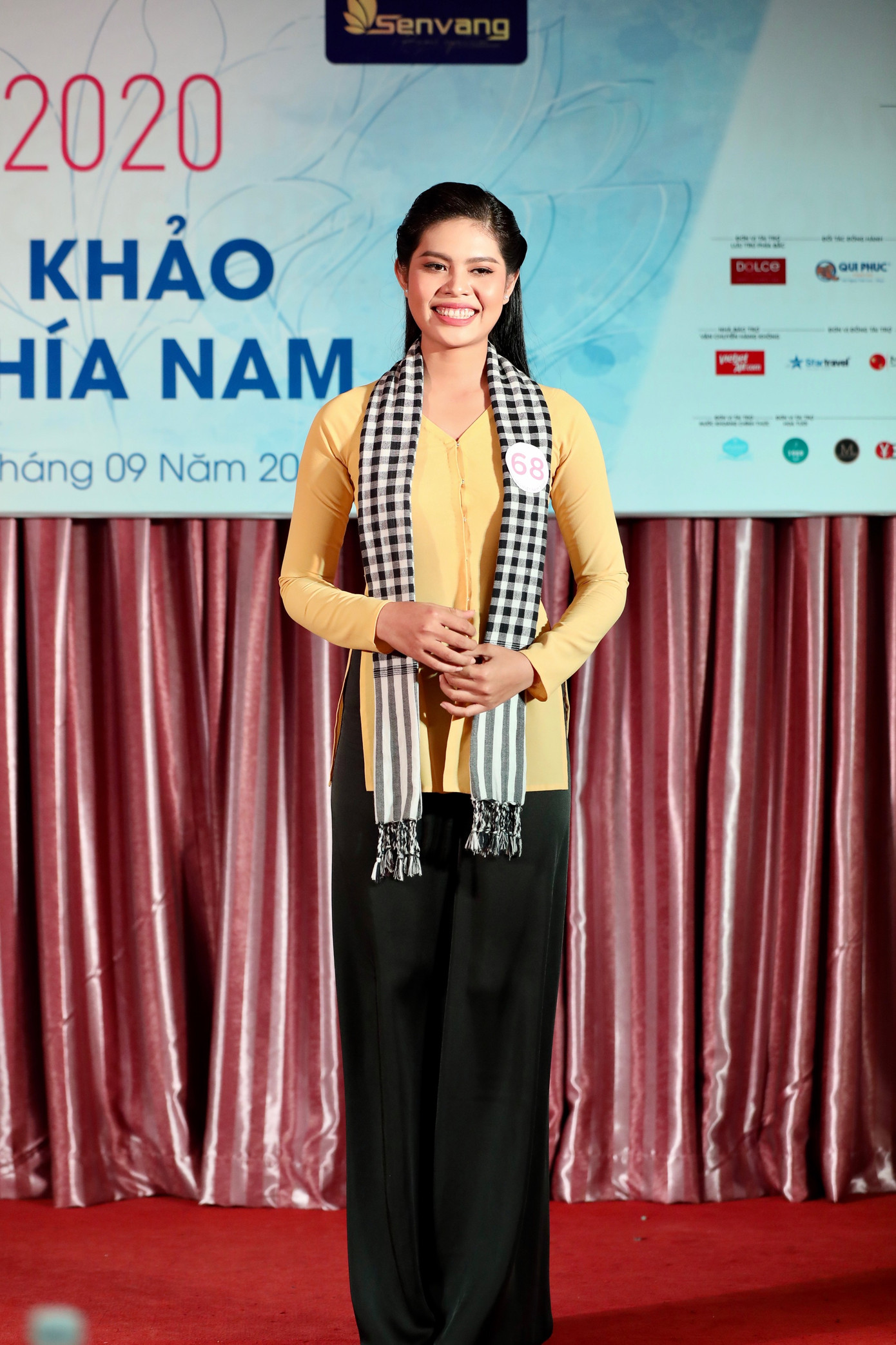Hương sắc Nam bộ ùa về hội trường cùng với thí sinh Ngô Thị Tường Vi. Đến từ Cần Thơ gạo trắng nước trong, Vi chọn bộ bà ba giản dị đi với chiếc khăn rằn rất dễ nhận diện.